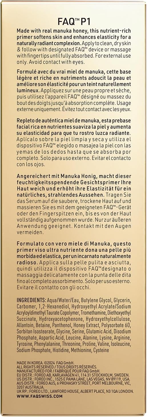De voedende, lichtgewicht geleidende FAQ P1 Manuka Honey is een zoete behandeling om de huid voor te bereiden en beschermen met perfecte druppels die bestaat uit een krachtige anti-aging-mix die verrijkt is met een allantoïne- en aminozurencomplex. Manuka-honing is een premium product uit Nieuw-Zeeland en een van de meest potente en heilzame soorten honing ter wereld met de kracht van de natuur om de enige huid die je hebt te beschermen en perfectioneren. De primer is gebaseerd op de extravagante antioxiderende en hydraterende eigenschappen van de Manuka-honing, verzacht zichtbaar en verbetert de elasticiteit voor een natuurlijk stralende, zachte en jonger uitziende huid. Het superbestanddeel van kamille, allantoïne, is een huidvriendelijk bestanddeel dat de huid onmiddellijk en zichtbaar verzacht en hydrateert en zelfs in de meest gedroogde huid de dehydratatiesymptomen aanpakt en de huid soepel en zacht maakt, geïmpregneerd met een hydratatie op de lange termijn. De primer is geleidend en gaat perfect samen met de EMS- en RF-technologie van de FAQ 100-serie apparaten voor volledige veiligheid en verbeterde behandelingsresultaten. Het bevat geen bestanddelen die op de zwarte lijst staan, is zacht en uitgebreid dermatologisch getest, geschikt voor alle huidtypes en zet de klok terug met een dunne laag verzorgende bescherming.