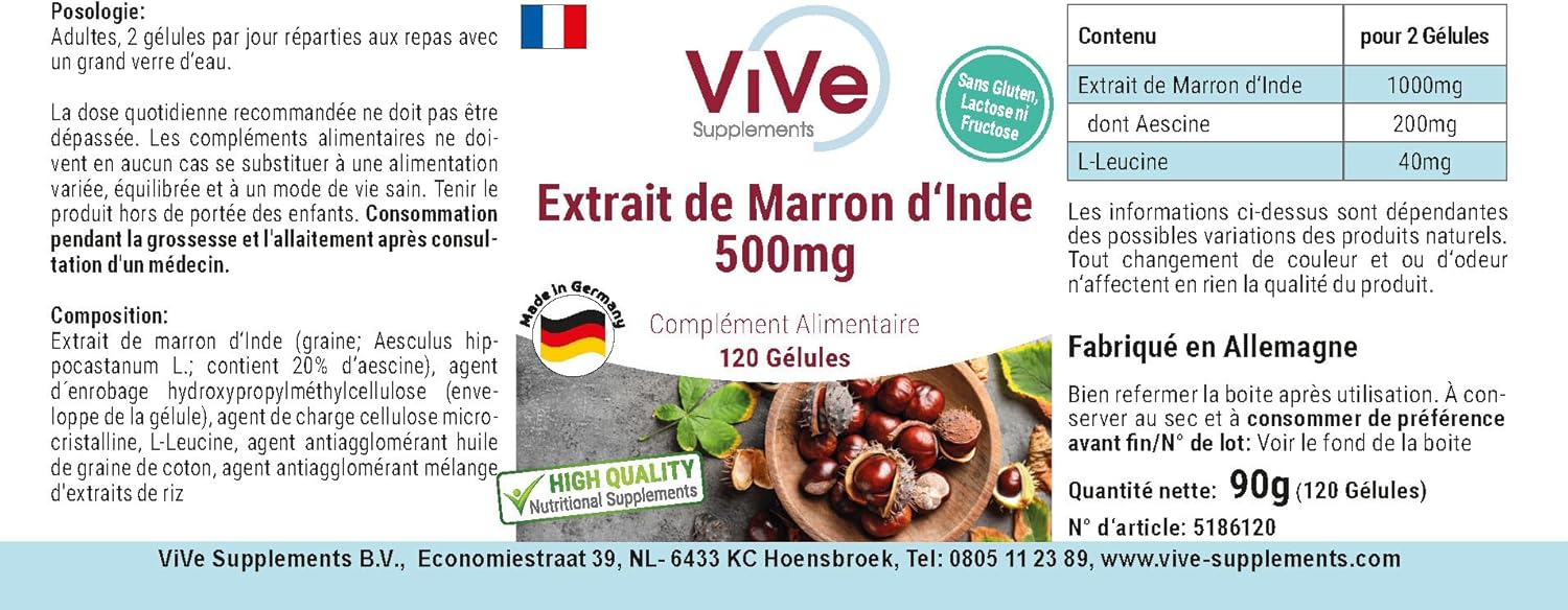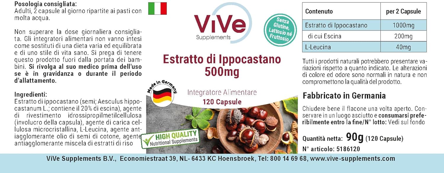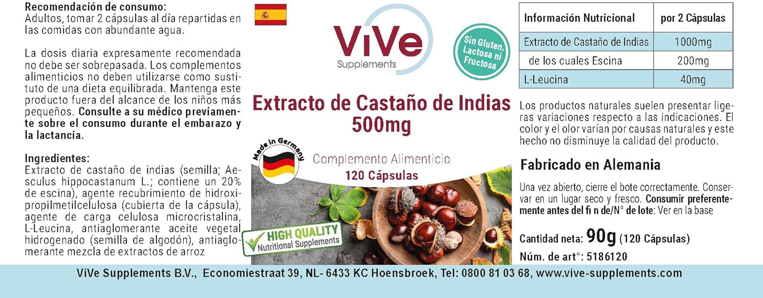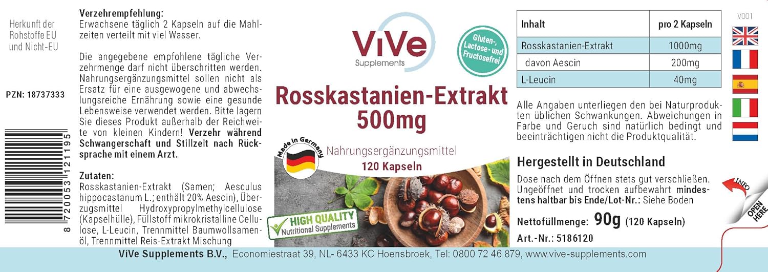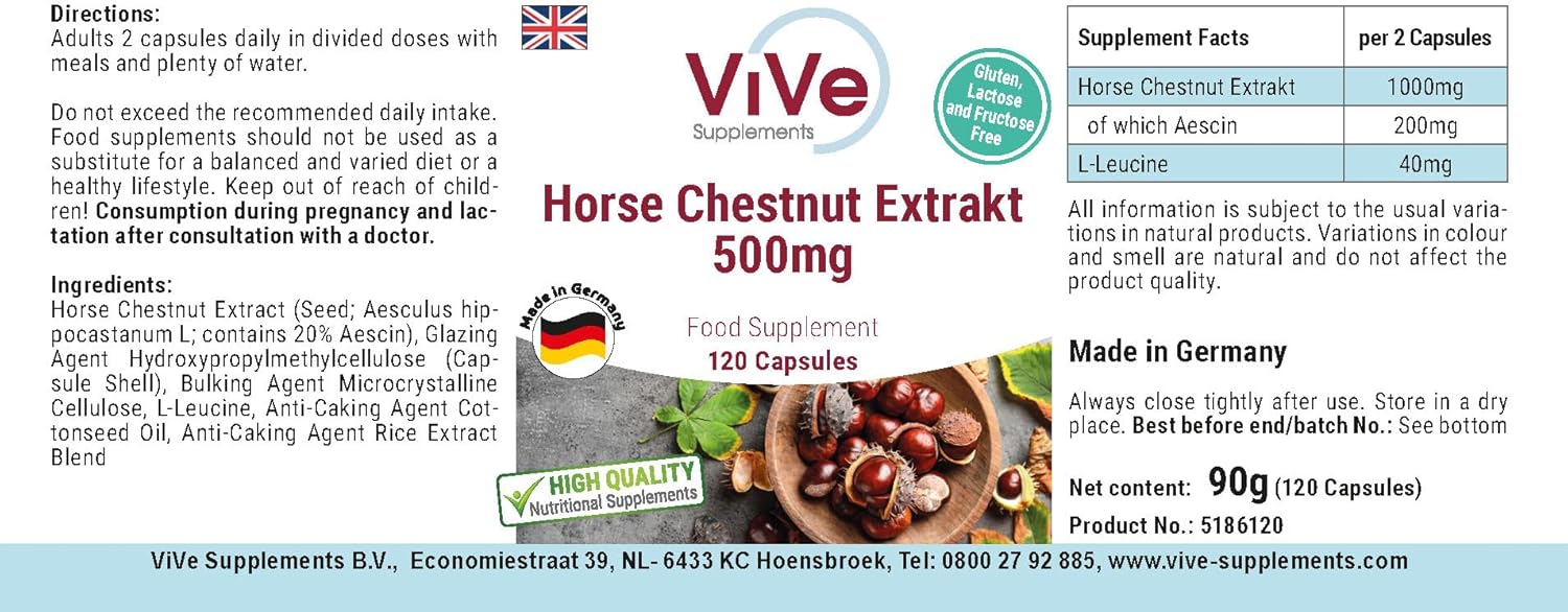 Paardenkastanje-extract 500 mg, 120 capsules, gestandaardiseerd extract met 20% aescine, hoge dosis en veganistisch, kwaliteit uit Duitsland ViVe Supplements