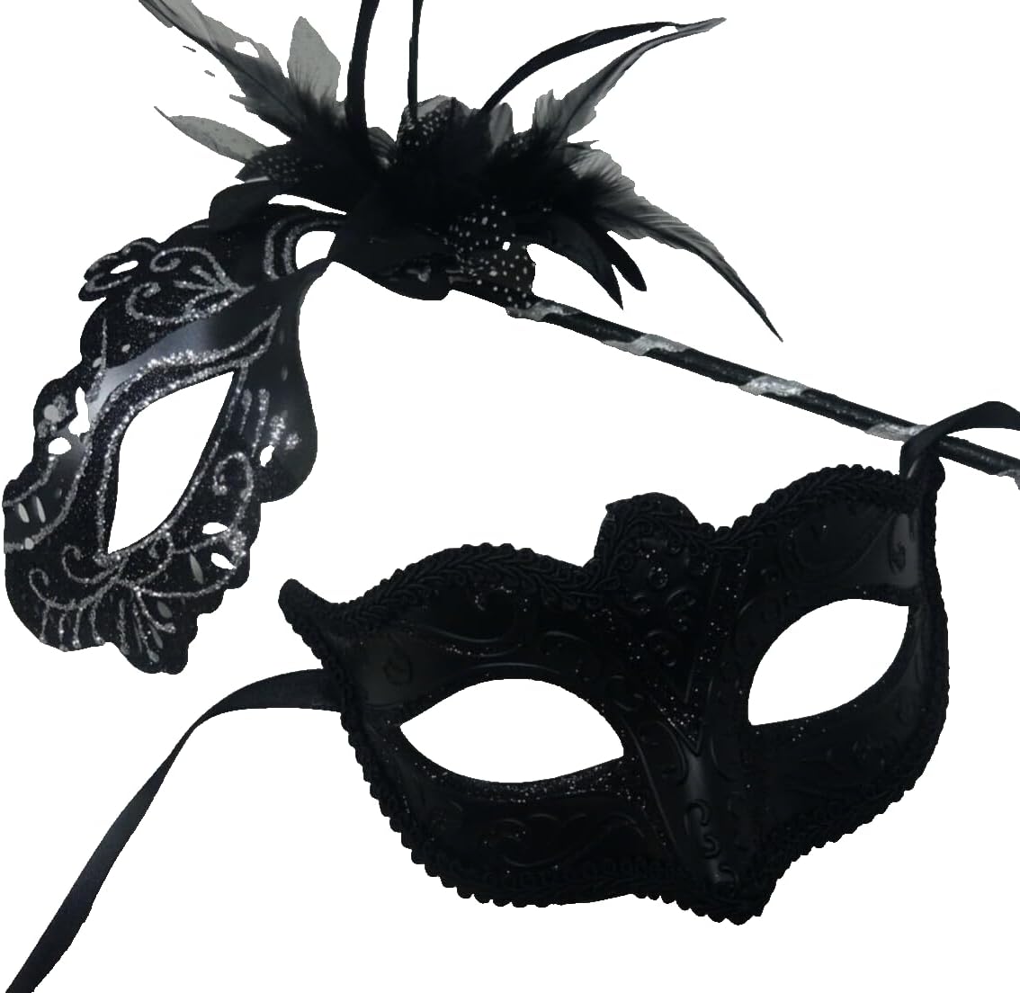 PAARS MASKERS SPARKLING ZWART EN ZILVER RIALTO VENETIAANSE MASQUERADE CARNAVAL PARTY OOGMASKER HAND GEHOUDEN OP EEN HOUTEN STOK