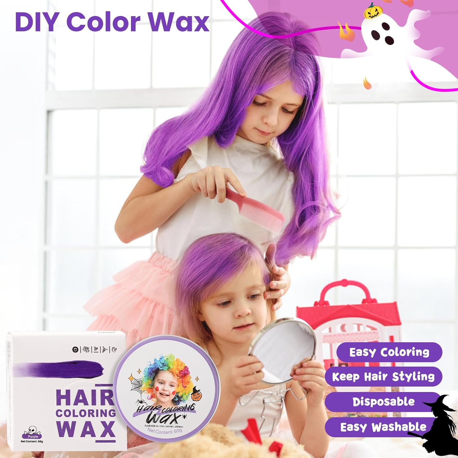 Onmiddellijke haarkleuring: onze gekleurde haarwax transformeert je look en biedt een leuke en tijdelijke haarkleurervaring. Met onze op water gebaseerde haarwax kun je je haar tegelijkertijd stylen en verven. Deze paarse haarkleur biedt snelle en effectieve haarkleuring, perfect voor degenen die vaak hun haarkleur veranderen.