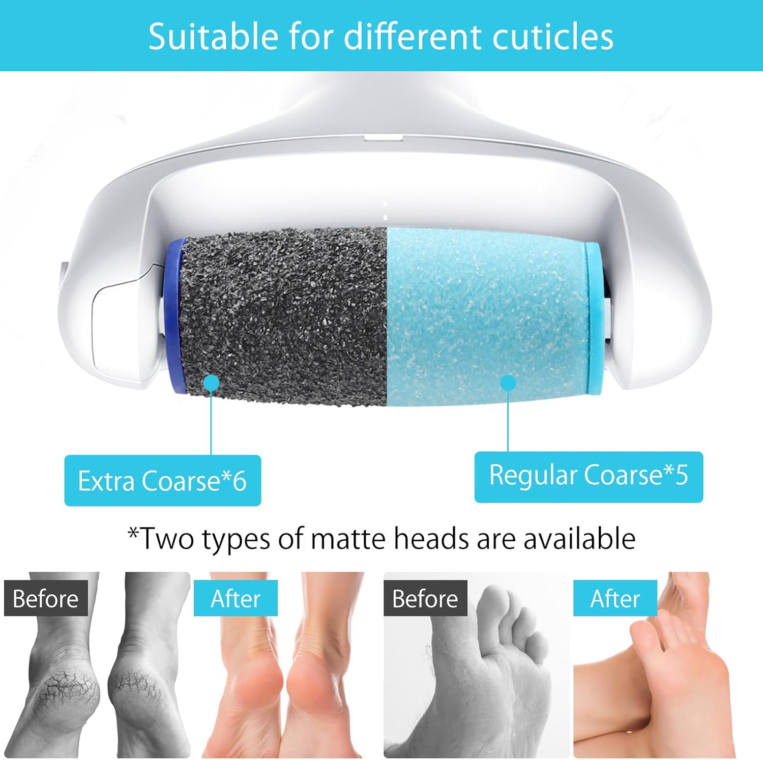 6 extra coarse and 5 regular coarse grooves: these extra coarse replacement rollers (blue) can quickly and effectively remove stubborn dead skin and dead skin with 2 different roughness levels for your hard skin removal needs. Regular Coarse for the care and smoothing of normal hard skin, mild grain for the perfect care and daily maintenance.