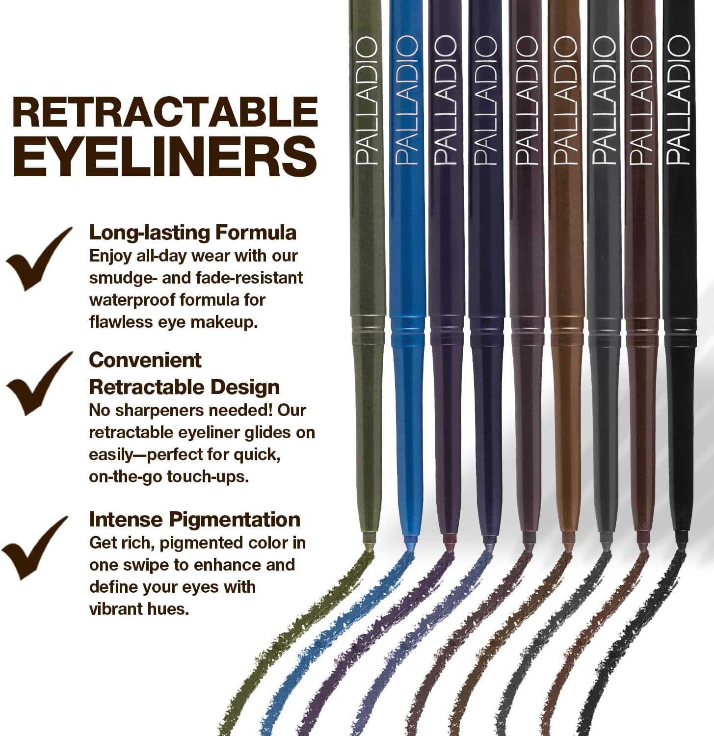 SLIDABLE WATERPROOF EYELINER: Palladio Eyeliner Retractable Eyeliner Pencil features a slim, pencil-like design that is easy to apply and a pull-out tube that allows the pencil tip to be easily inserted and removed. The handy swivel tube never needs to be sharpened.