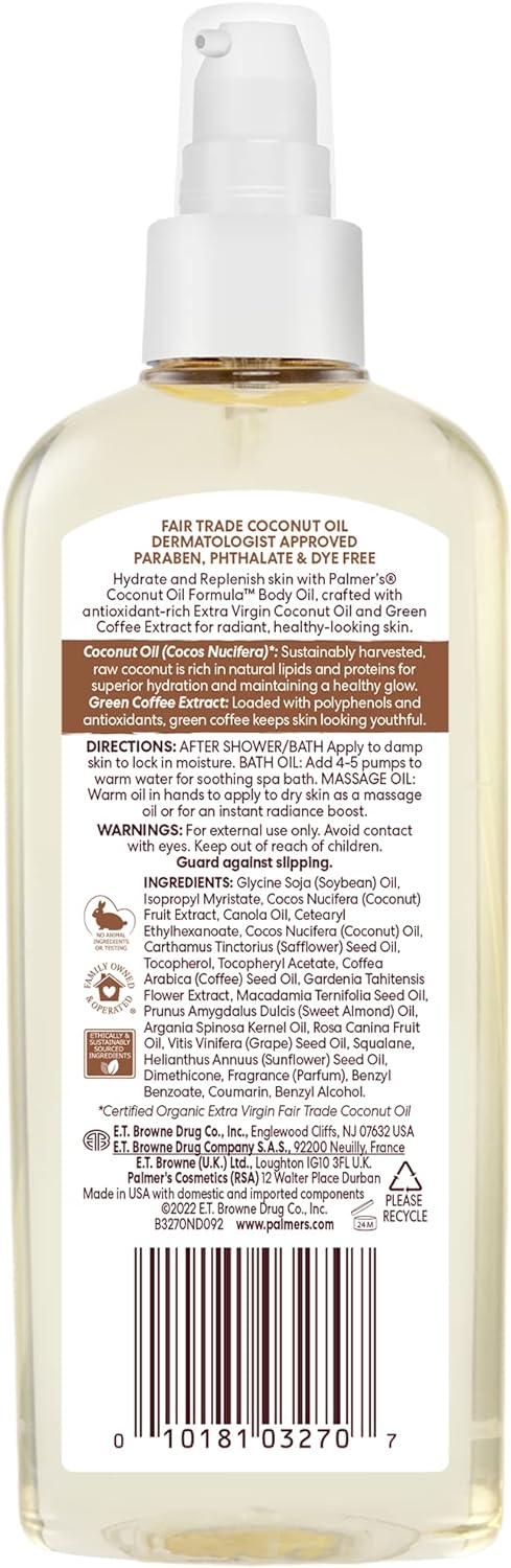 I absolutely love Palmer’s Coconut Oil Formula Body Oil! It’s a game-changer for my skincare routine. The oil is lightweight but incredibly nourishing, and it absorbs quickly without leaving a greasy residue. It has a lovely tropical coconut scent that isn’t overpowering, which makes it feel luxurious but not too strong.I’ve been using it for a few weeks now, and my skin feels noticeably softer and smoother. It’s perfect for after showering, as it helps lock in moisture and gives my skin a healthy, hydrated glow. I’ve also used it on dry patches and scars, and it’s been great at soothing and moisturizing.The 150ml size is just right for everyday use, and a little goes a long way. I love that it’s made with natural ingredients like coconut oil, which makes it feel like a treat for my skin. It’s also great for those with sensitive skin, as it’s gentle and not irritating.Overall, I highly recommend Palmer’s Coconut Oil Formula Body Oil! It’s affordable, effective, and leaves your skin feeling amazing. I’ll definitely be repurchasing this product.