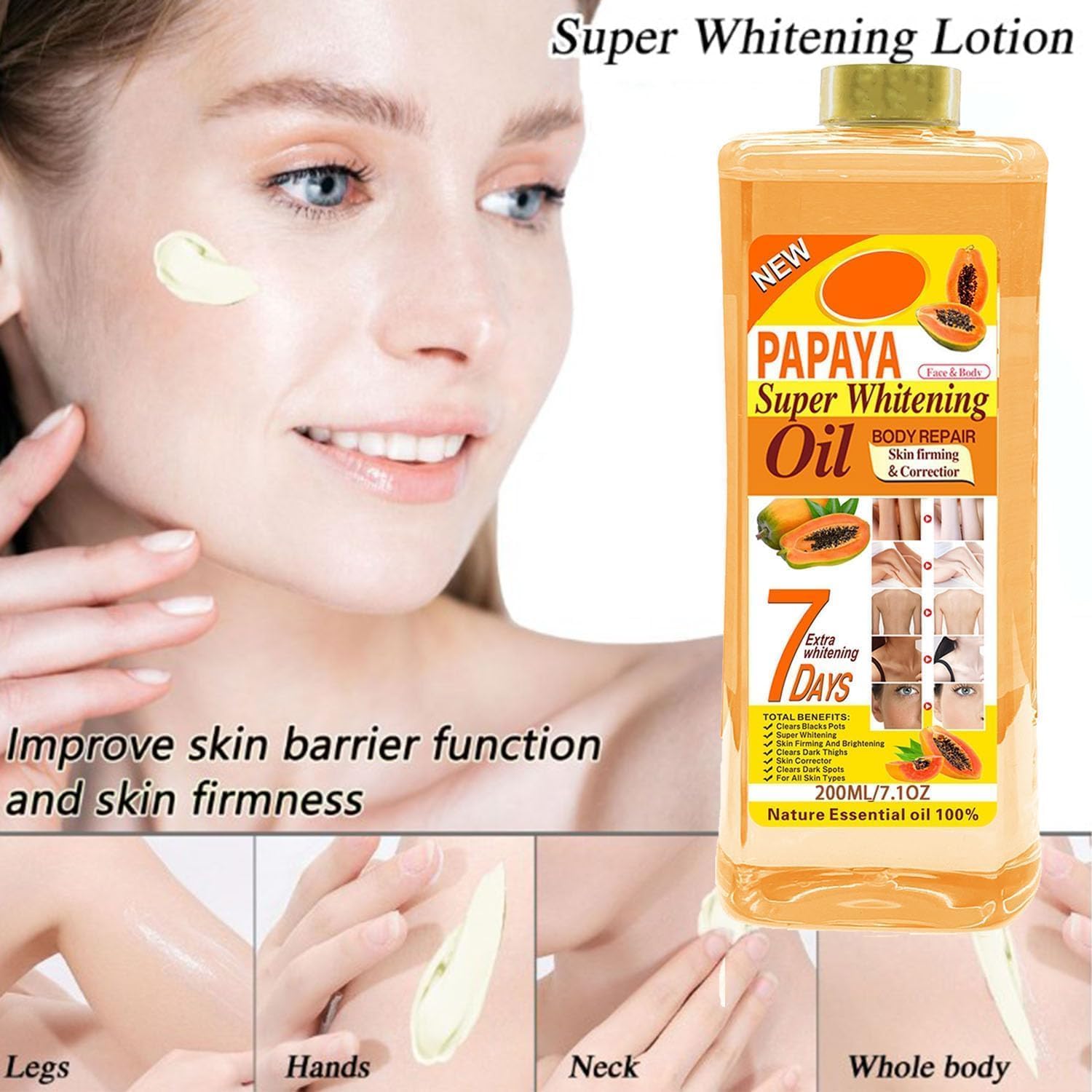 Papaya Super Whitening Oil is designed to nourish and lighten the skin, providing a radiant glow and anti-aging benefits. It is suitable for all skin types and can be used on the face, neck, back, hands, and feet.