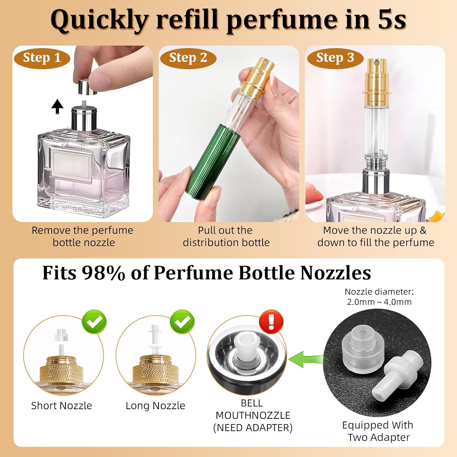 ✅ Eenvoudig bij te vullen: Inclusief 1 gouden en 1 groene verstuiver, 1 labelstick, 2 adaptersets. Het bijvullen van de verstuiver gaat snel en probleemloos met het eenvoudige druk-aan-vulmechanisme. Lijn de basis gewoon uit met je favoriete parfummondstuk en blijf drukken tot de fles vol is – geen trechters of druppelaars nodig! (Tip: Zorg ervoor dat u alle lucht uit de fles verdrijft voordat u de eerste keer bijvult.)
