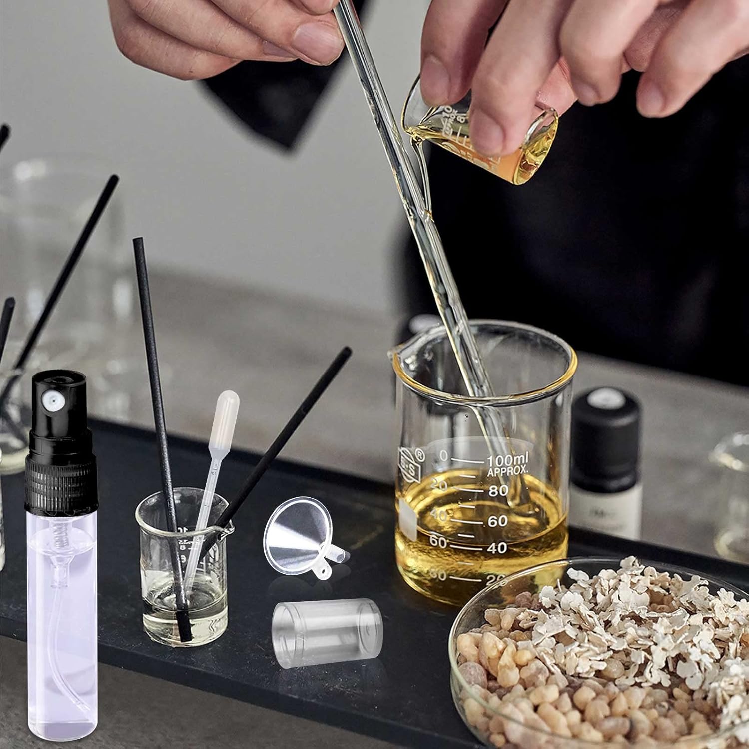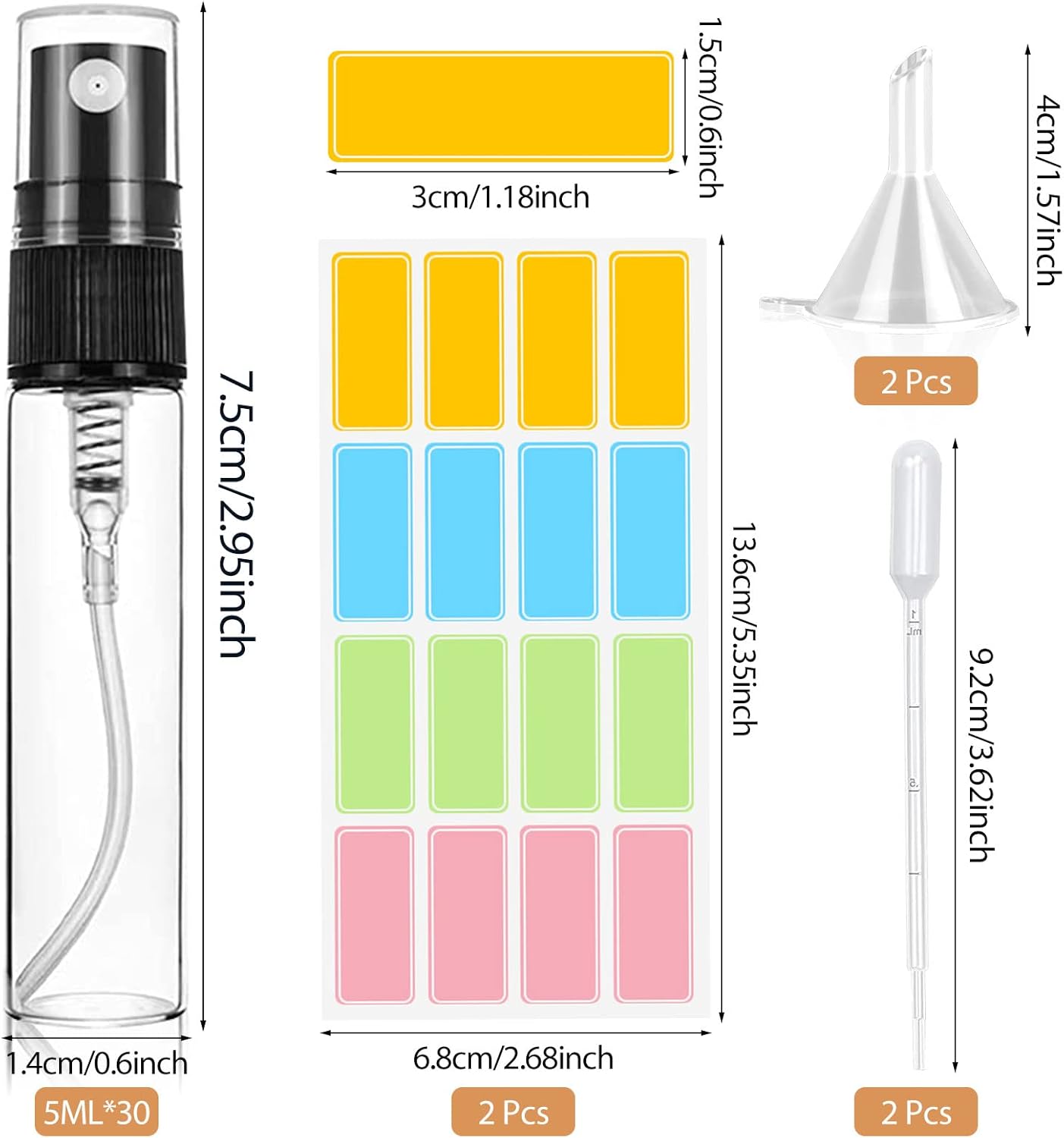 Inhoud van de verpakking: 5 ml parfumverstuiver x 30, etiket x 2, trechter x 2 en pipet x 2. Hiermee kunt u eenvoudig de gewenste vloeistof overbrengen en de vloeistof in de fles identificeren. Geschikt voor dagelijks gebruik of op reis.