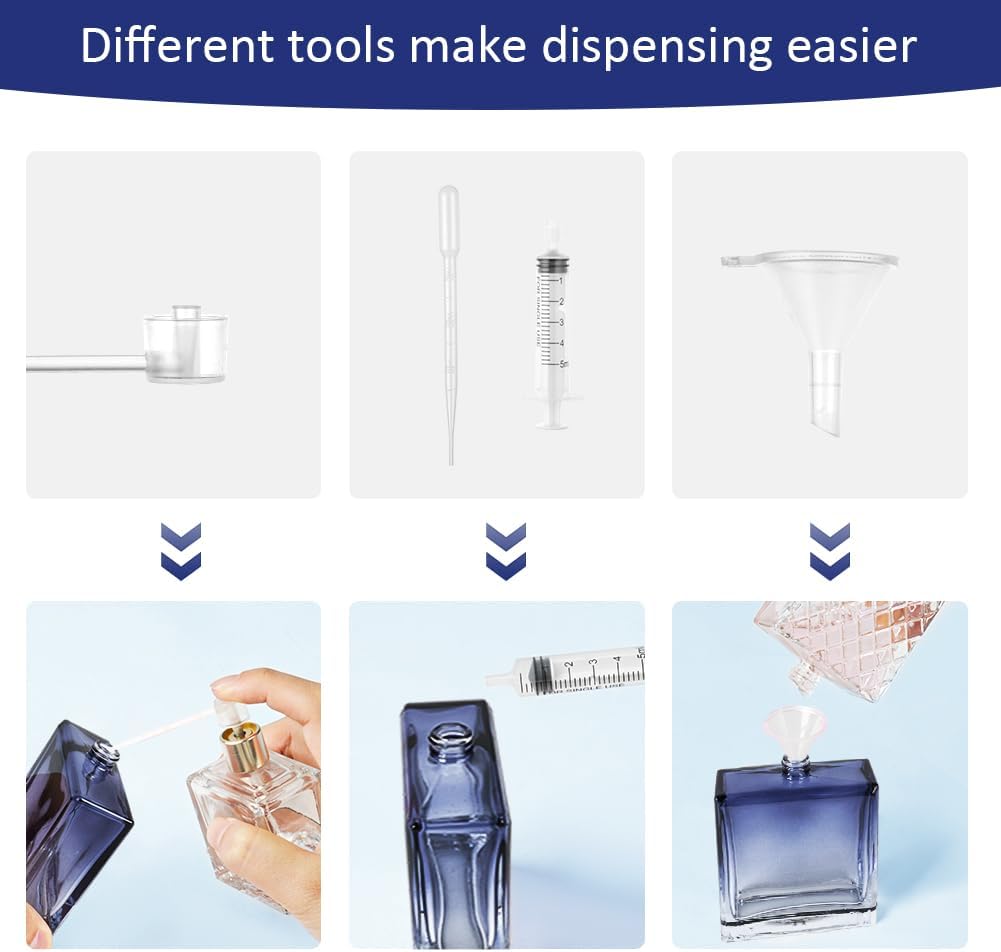 Breed inzetbaar: spuitflessen hebben een breed scala aan toepassingen. Ze kunnen worden gebruikt om parfum, etherische oliën en luchtverfrissers op te bergen of om je eigen parfum te mengen, de originele fles te vervangen enz