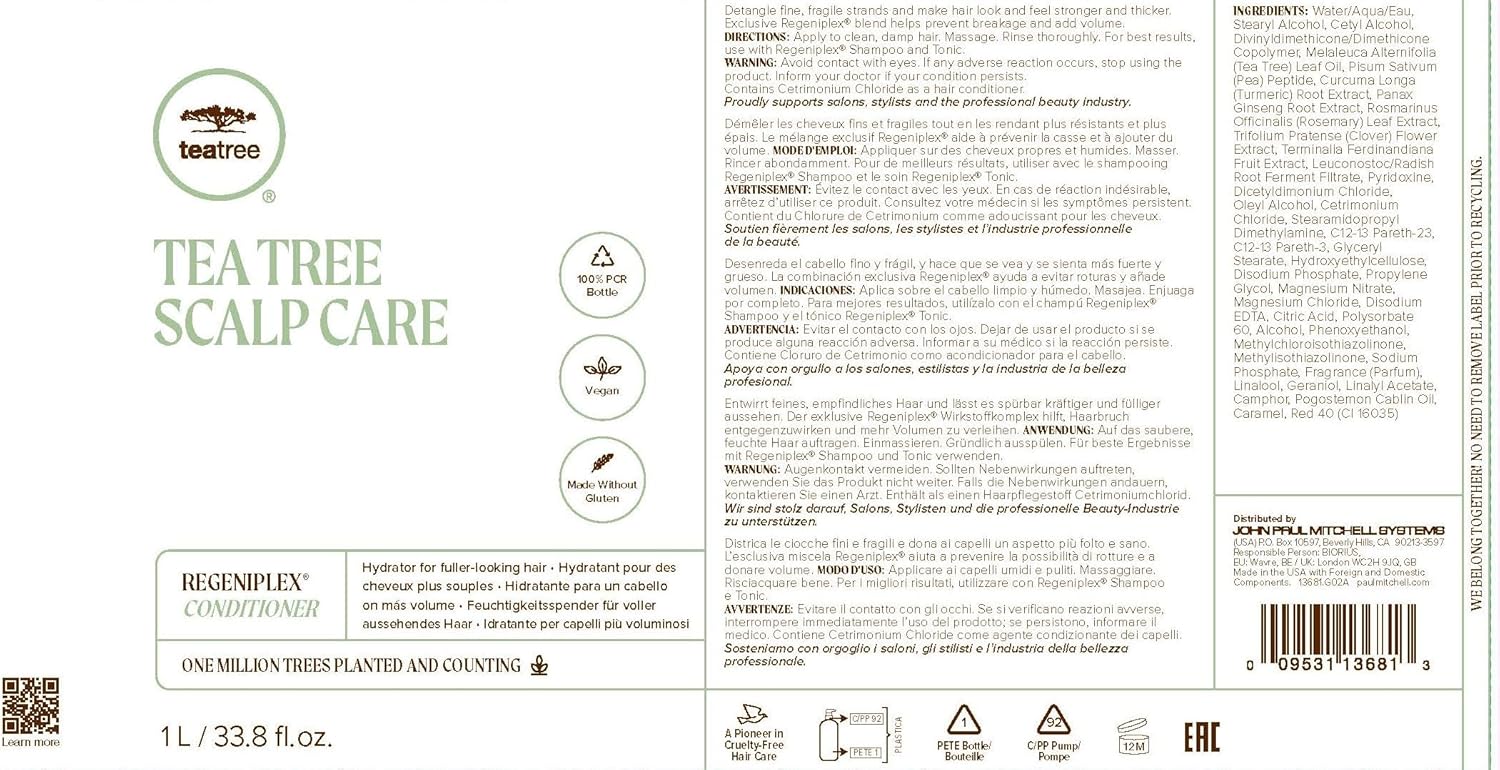 Tea Tree Scalp Care Anti-Thinning Conditioner – niet-verzwarende conditioner ontwart fijn, broos haar. Het exclusieve Regeniplex complex van werkzame stoffen bevat pluimen, erwtenpeptiden, weideklaverextract, kurkuma en ginseng en helpt om volume op te bouwen en zorgt voor voller, sterker haar. Ontwart het haar zonder te verzwaren. Een kleine hoeveelheid op het gewassen, vochtige haar aanbrengen en inmasseren. Grondig uitspoelen.