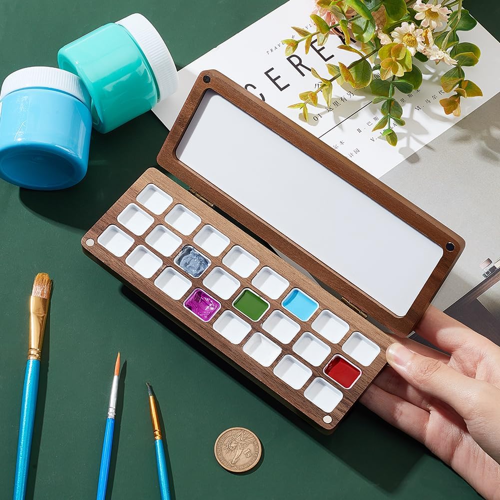 24 roosters houtpalet met mengbak: het heeft 24 roosters aan één kant en je kunt verf direct in de gaten persen. Het wordt geleverd met een kleurmengbak aan de andere kant. Gevuld met de verf die je nodig hebt of favoriet en reis ermee. Geweldig voor urban sketchers.