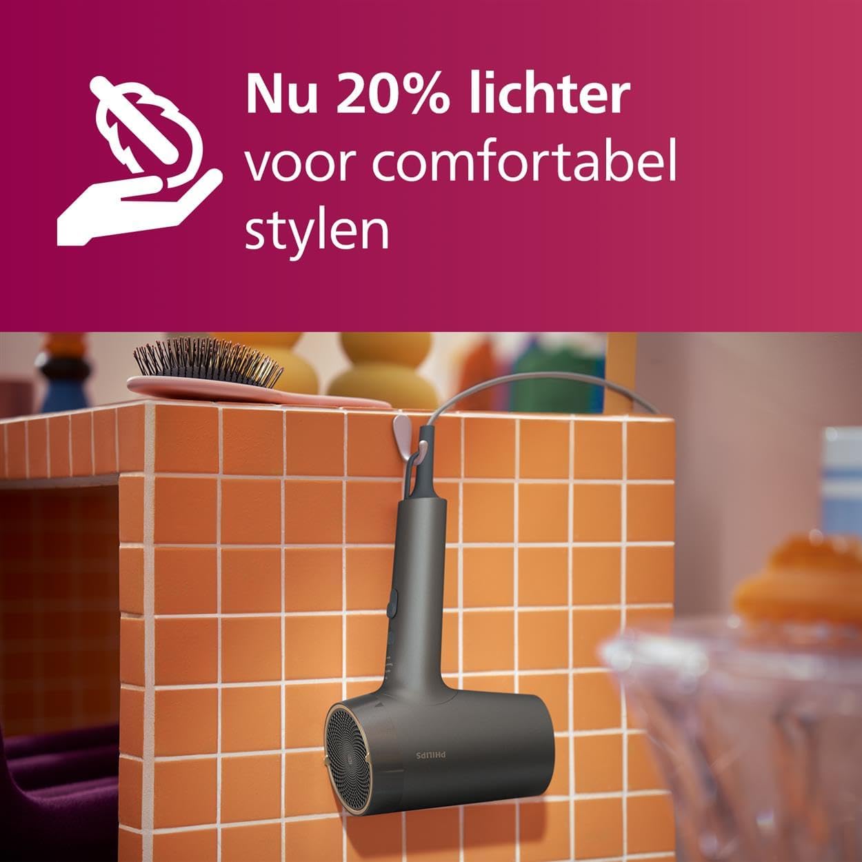Nu 20% lichter⁶ voor comfortabel stylen: deze ergonomische föhn met diffuser en mondstuk heeft een lager gewicht, zodat je comfortabel en gemakkelijk kunt drogen en stylen