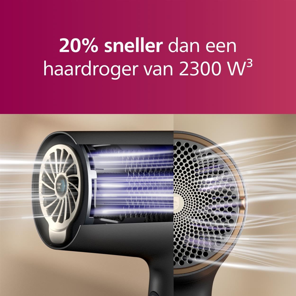 20% sneller dan een föhn met 2.300 watt³: het efficiëntere droogsysteem verbetert de luchtstroom en de warmteoverdracht. Daarom overtreft deze haardroger met 1.800 watt zelfs een föhn van 2.300 watt³