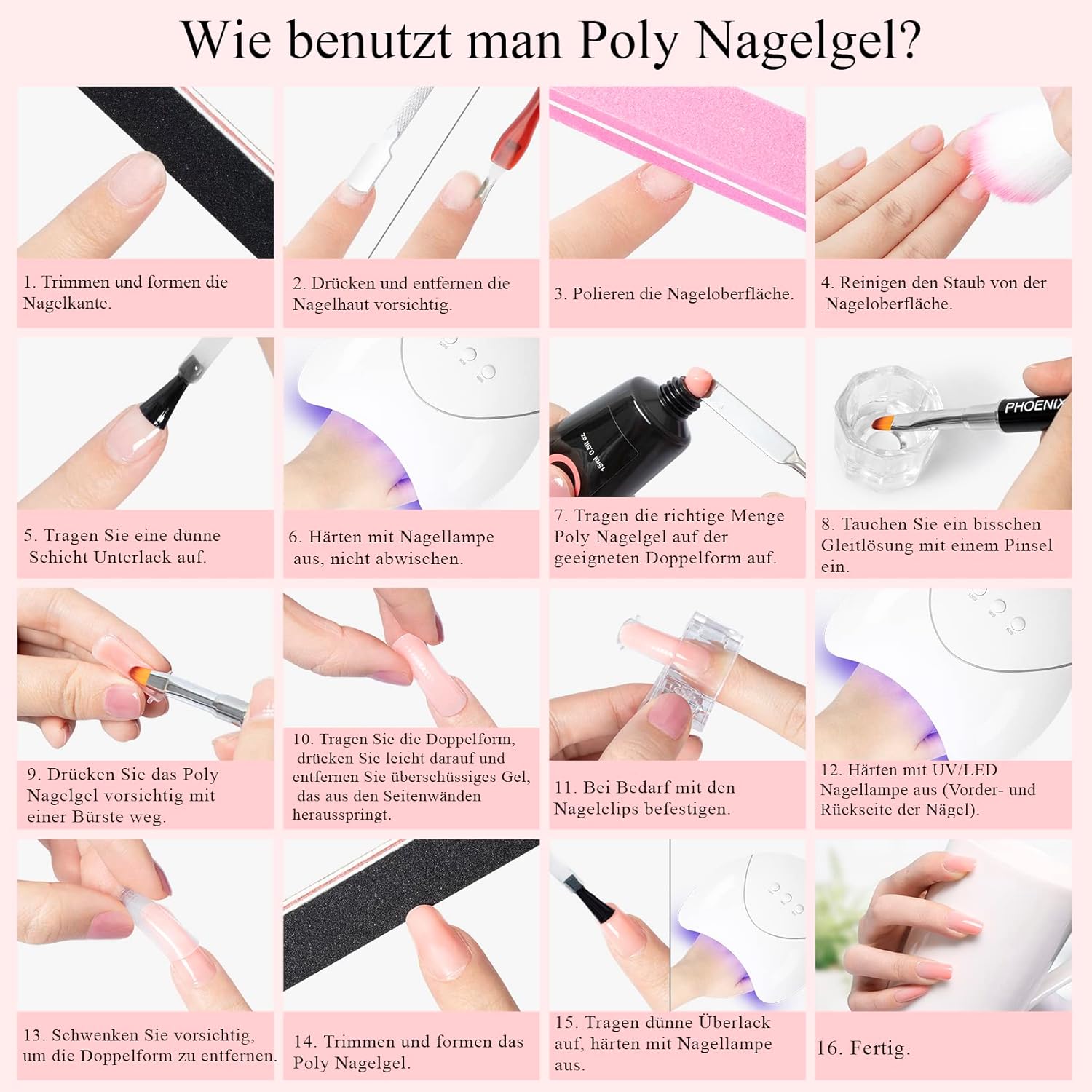 Ich habe mir trotz nur 2 Bewerbungen dieses Set bestellt um es zu testen. Ich habe bei einer Freundin Polygel testen dürfen und wollte dies nun selber Zuahsue haben.Mein Fazit ist, für Anfänger okay.Das Polygel lässt sich sehr schön bearbeiten und verteilen, aber.. das Gel härtet Oberflächlich nicht ganz aus. Habe die Nägel 4 mal bei 120s mit der mitgelieferten Lampe rein getan und die Oberfläche war noch feucht. War für mich nicht schlimm, da meine Schicht eh dicker war und Oberflächlich eh noch gefeilt werden musste.Auf Dauer würde ich ein Gel einer anderen Marke nutzen, da die 4 mitgelieferten Tuben auch zu wenig ist. Eine Tube reicht für ca 2 mal Nägel machen, je nach Länge.Ich habe die goldenen Schablonen für unter den Nagel genutzt, da mir die mitgelieferten Nagelschablonen zu Hundekrallen Artig waren. Habe diese Technik zum ersten Mal genutzt und bin begeistert vom Ergebnis. Ich kann so sauberer arbeiten.Die Lacke sind farblich Geschmackssache und meiner Meinung nach nicht hochwertig, für Muster malen und ausprobieren okay, aber nicht für den ganzen Nagel. Lässt sich nicht schön verteilen.Alles in allem ist alles von den Bildern im Paket auch drin gewesen und für den Preis für Anfänger zum ausprobieren gut geeignet. Auf Dauer empfehle ich allerdings hochwertigere Sachen.Für mich fürn Anfang zuhause ist es absolut akzeptabel und würde es jedem für den Anfang empfehlen.