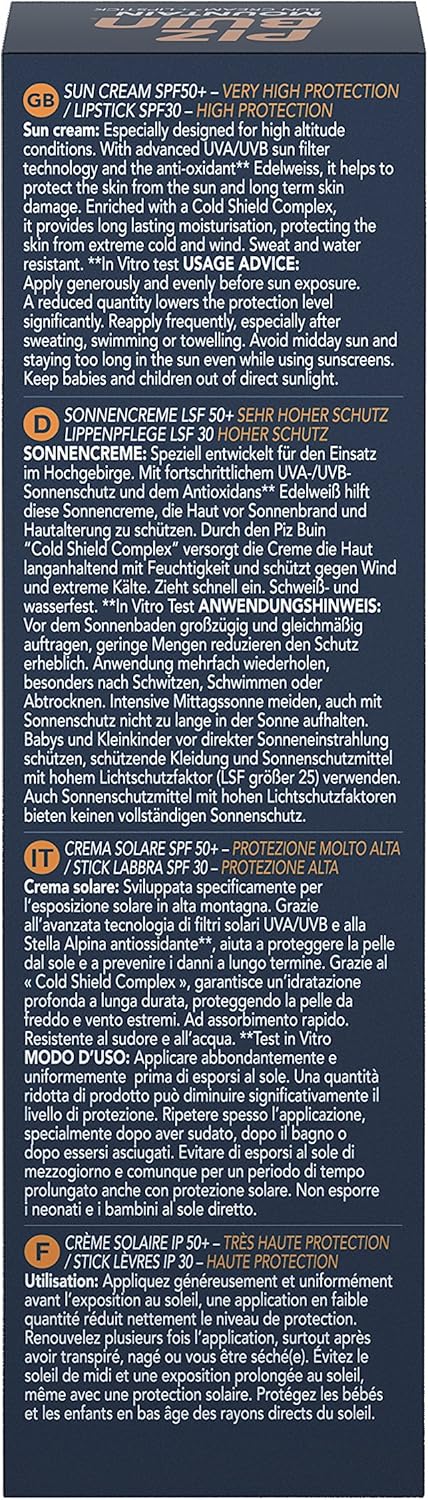Piz Buin Mountain combicrème SPF 50plus met lippenstift Hoge bescherming tegen zon, wind en kou Geschikt voor bergen en klimmen