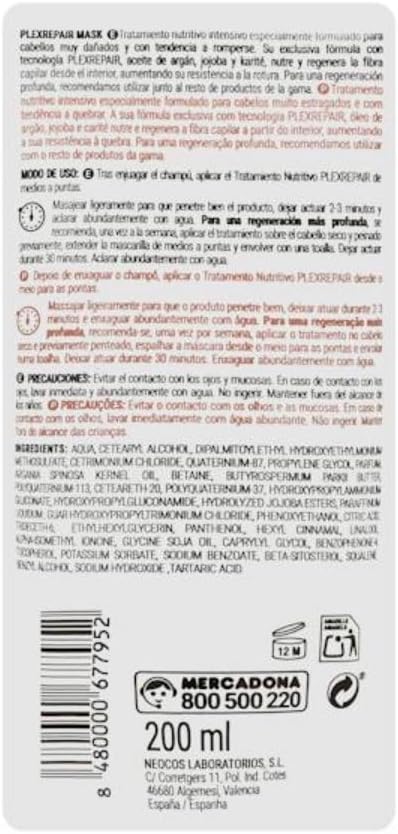Speciaal samengesteld masker voor zwaar beschadigd haar met een neiging om te breken. Zijn unieke formule met de technologie Plexrepair, Argan, Jojoba en Shea voedt en regenereert de haarvezels van binnen en verhoogt de scheurvastheid. Voor een diepe regeneratie adviseren wij het gebruik samen met de andere producten uit het assortiment. Gebruik: na het spoelen van de shampoo de Plexrepair voedingsbehandeling van de middelen tot aan de punt aanbrengen. Licht inmasseren, zodat het product goed doordringt. 2-3 minuten laten inwerken en grondig met water afspoelen. Voor een diepere regeneratie wordt eenmaal per week aanbevolen. Breng de behandeling aan op droog en voorgekamd haar, verdeel het masker van middel naar punten en wikkel het in met een handdoek. Laat 30 minuten staan. Grondig met water afspoelen.