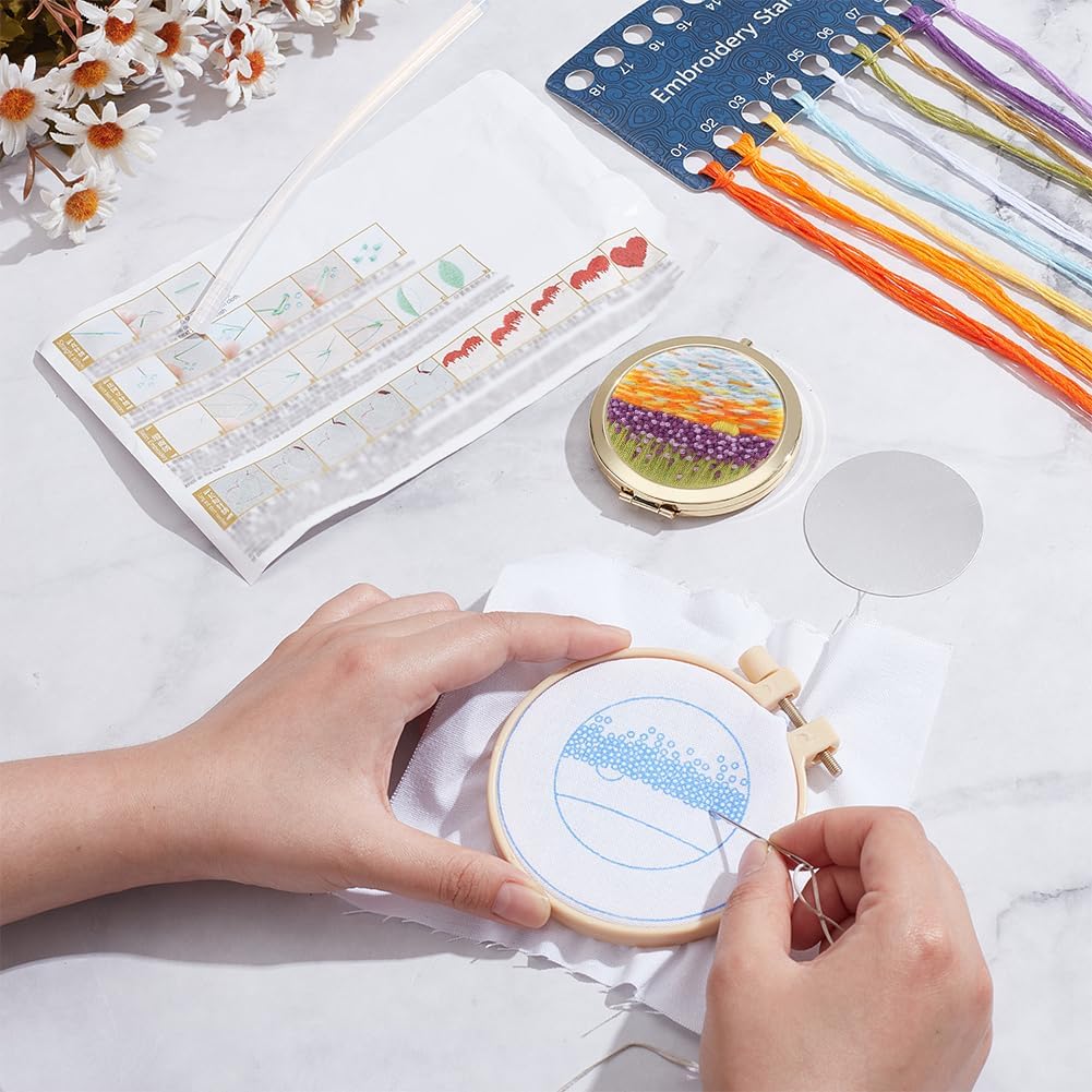 Borduurspiegel maken kit: je ontvangt een complete set borduurmateriaalpakketten, inclusief een metalen spiegel, borduurstoffen, draden, naalden en instructie, enz., waarmee je een mooie en unieke borduurspiegel kunt maken