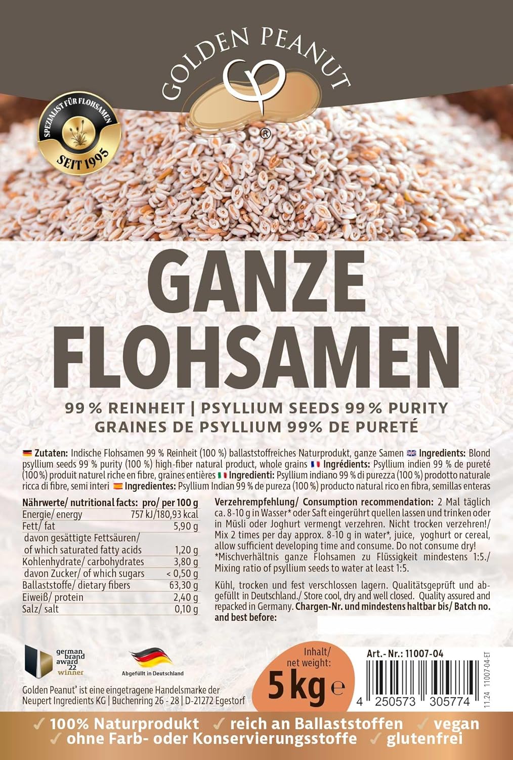 Zuiverheidsgraad: de premium psylliumzaden van Golden Peanut zijn vrij van conserveringsmiddelen of kleurstoffen. De toegelaten botteling bij Golden Peanut is volgens de strengste kwaliteitseisen voortdurend gecontroleerd door de levensmiddelencontrole.