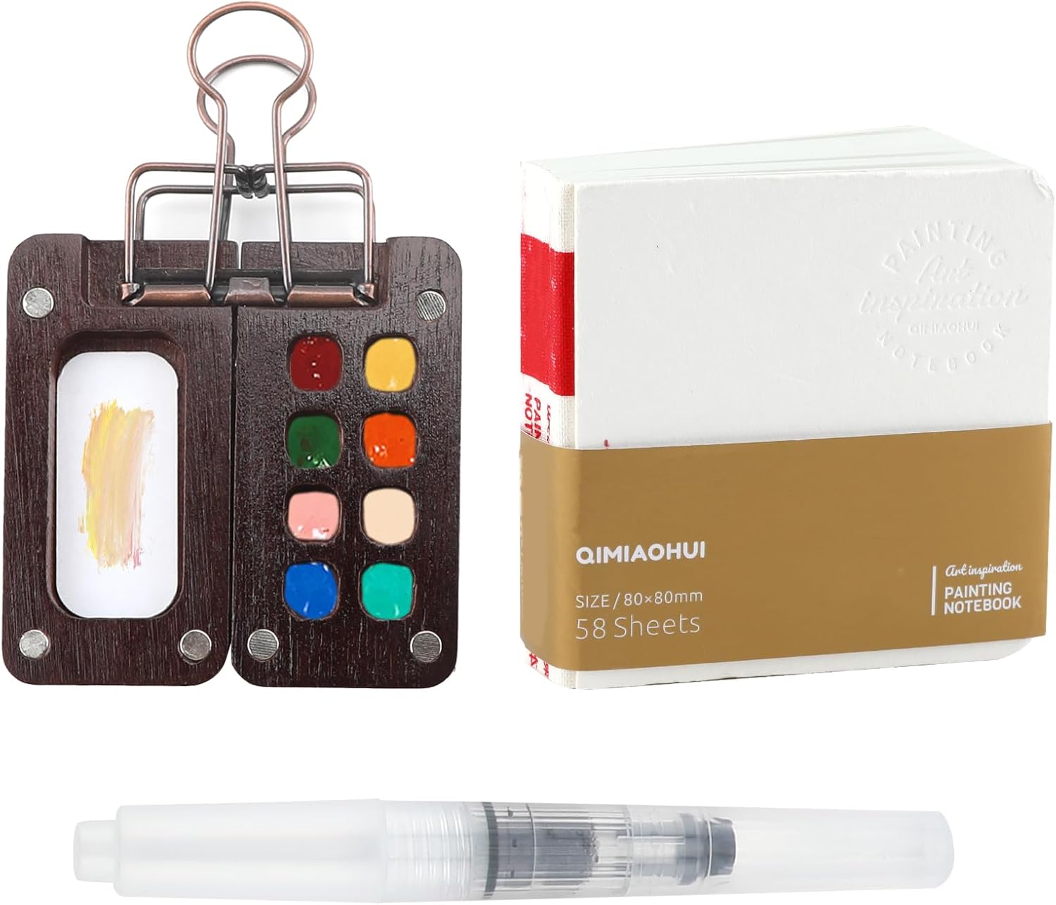 Pocket Artist Watercolour Travel Set Mini Waterverfverfpaletset met 8 rasters Houten draagbare bindclip Verf- en waterpen Schetsboekset Cadeau voor studenten Schilders en kunstenaars Buiten