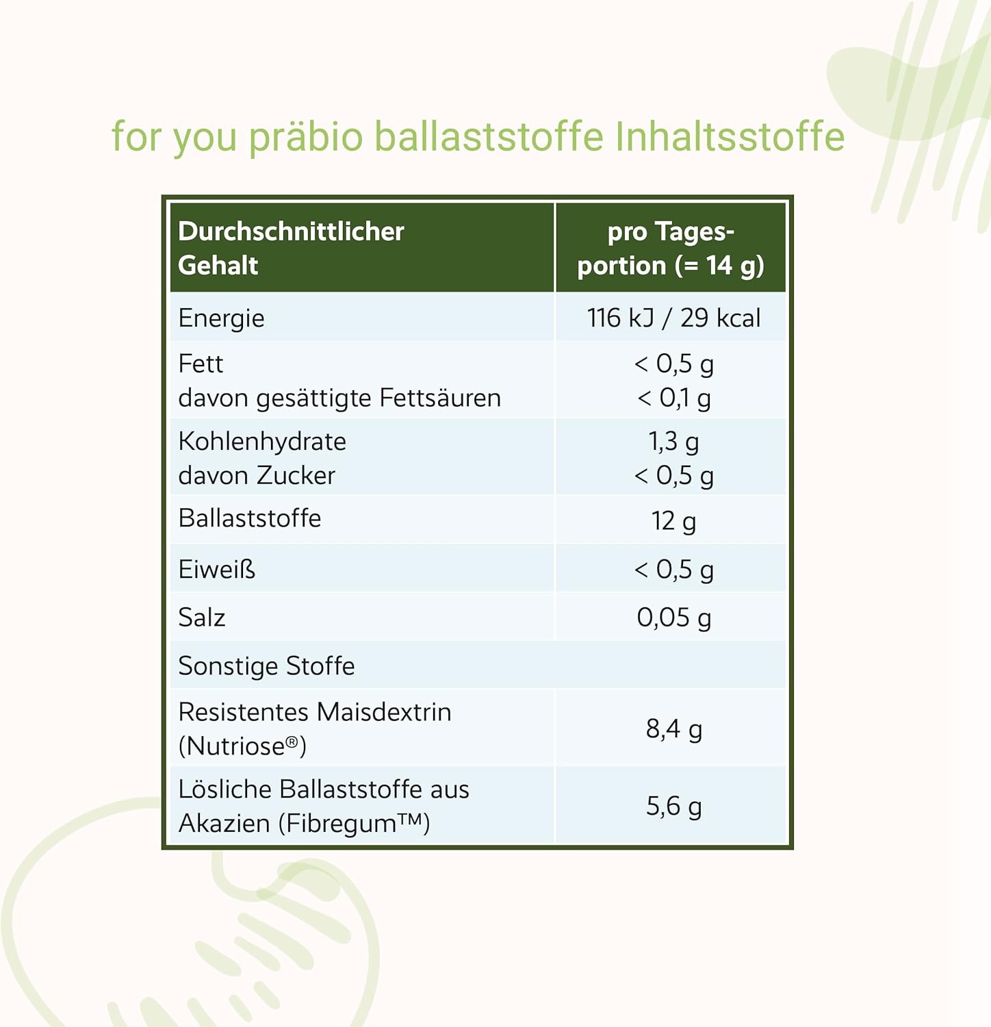 Natuurlijke grondstof van het merk | Bevat de geregistreerde grondstoffen van het merk Fibergum uit de acaciavezel uit de biologische landbouw en nutriose-resistente dextrine van maïs. Het vezelpreparaat bestaat dus uit 100% zuivere plantaardige vezels, is zonder toevoegingen, suikervrij, veganistisch, tarwevrij, lactosevrij en neutraal van smaak.