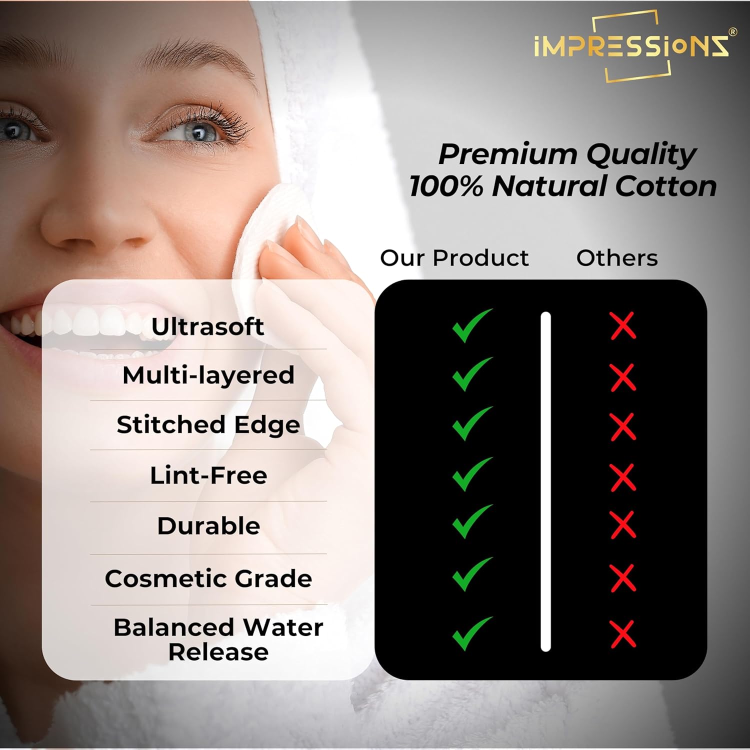 ImpressionZ Premium Cotton Rounds for Face are designed to elevate your skincare routine with 100% natural cotton, offering the highest level of softness, absorbency, and gentleness. These hypoallergenic, lint-free cotton pads are perfect for removing makeup, applying toners, creams, oils, and lotions. They are also ideal for exfoliation with their textured surface, helping to brighten your complexion and leave your skin feeling rejuvenated. Crafted with multi-layered cotton and reinforced edges, these durable cotton rounds are made for daily use, ensuring a smooth, irritation-free experience. The pads remain intact even when wet, making them perfect for wet or dry applications. Whether you’re cleaning your face, removing makeup, or applying skincare products, these cotton pads are an essential tool for anyone seeking a mess-free, effective solution for all beauty needs.