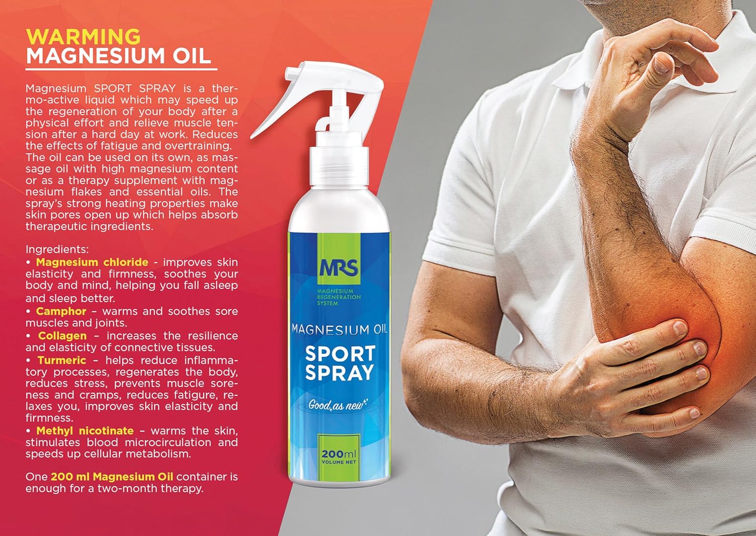 Premium Magnesiumoliespray met Collageen, Ontspannen en Herstellen van Pijnlijke Spieren en Krampen, MRS Sports Spray, Magnesiumregeneratiesysteem, 200 ml – 6.76 fl oz.