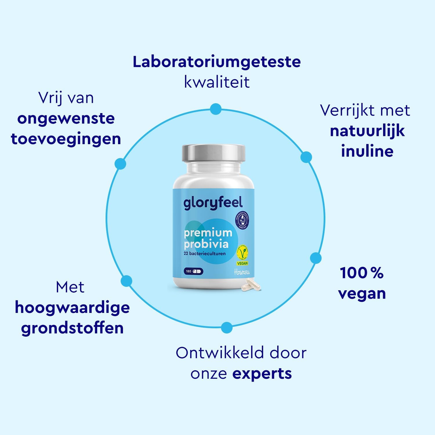💊 BESTE MERKGRONDSTOF HOWARU – Hoogwaardige darmbacteriën en prebiotica, HOWARU merkgrondstof. HOWARU bacteriestammen staan bekend om hun hoge kwaliteit en stabiliteit. Ze zijn bijzonder bestand tegen maagzuur en worden gefermenteerd in een gecertificeerde fabriek in Madison, Wisconsin, VS. HOWARU test en garandeert de veiligheid van de stammen door middel van klinische studies en strenge testen. Bevat 22 micro-organismen plus inuline. 10 miljard CFU per dagelijkse dosis (2 capsules).
