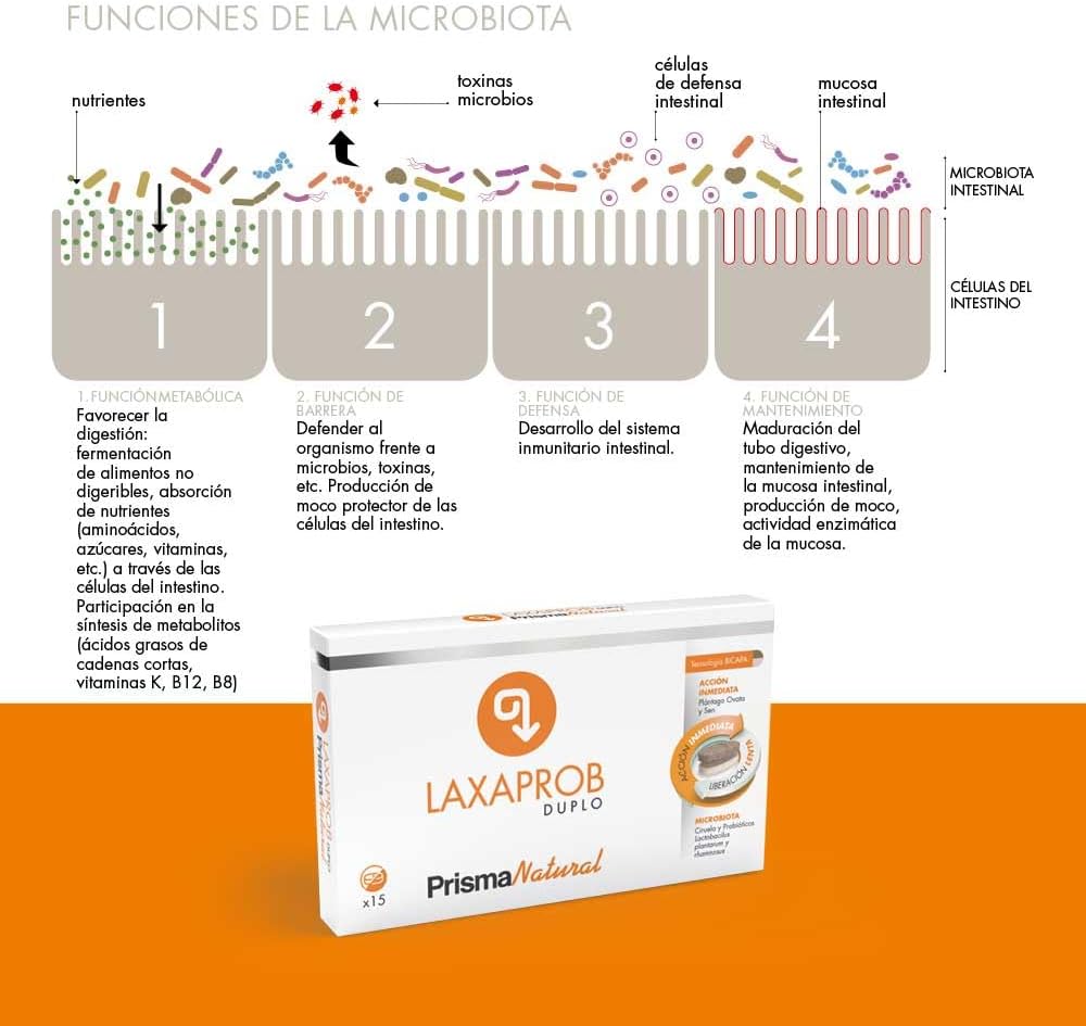 Prisma Natural – LAXAPROB-formaat met 15 tabletten met tweelaagse technologie. Voedingssupplementen op basis van natuurlijke ingrediënten. Onmiddellijk effect: Plantago ovata en sen. Langzame afgifte: Microbiota pruim en probiotica, Lactobacilus platarum en Rhamnomus. Gebruik: 1 tablet per dag innemen. darmtransport en bescherming van de microbiota. Levensstijl en slechte eetgewoonten leiden tot gastro-intestinale stoornissen die in het leven van de meeste mensen op de agenda staan, van de meest actieve tot onderdompeling in een levensplan dat wordt gekenmerkt door zittende activiteit.