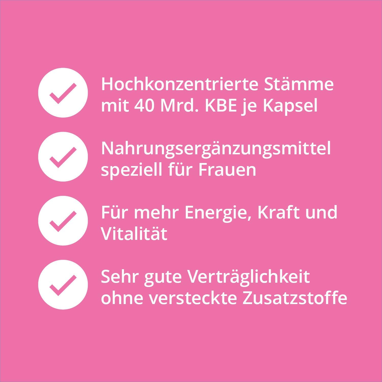 Hoog geconcentreerde bacteriënculturen (40 miljard KBE per capsule), speciaal voor vrouwen afgestemd Inuline als prebiotica voor de bacteriën vergemakkelijkt de permanente afzetting van de bacteriestammen in de darm Natuurlijke D-mannose en waardevol cranberry-extract moeten een positief effect hebben op de blaas van de vrouw Vitamine B3 (niacine) ondersteunt het behoud van normale slijmvliezen Vrij van ongewenste additieven Veganistisch en dierproefvrij