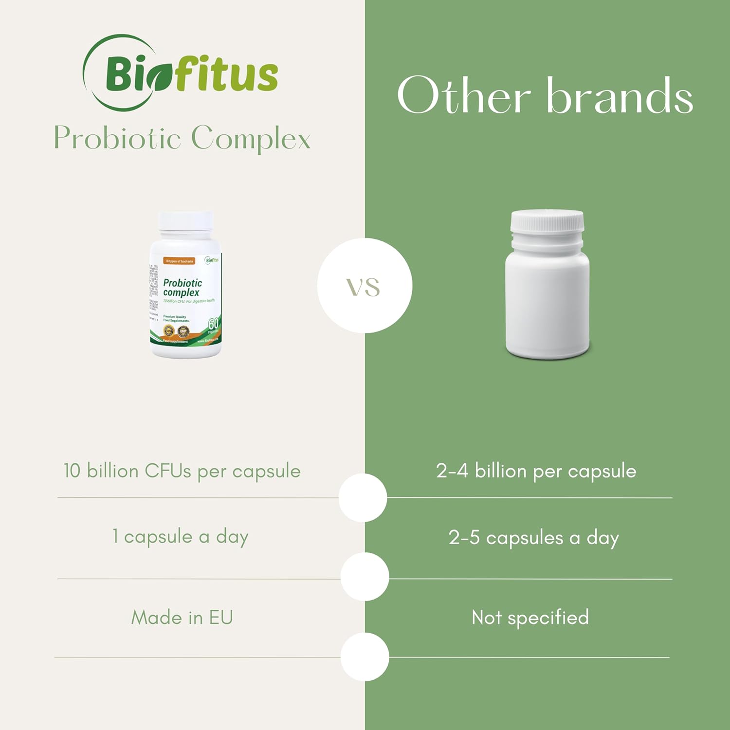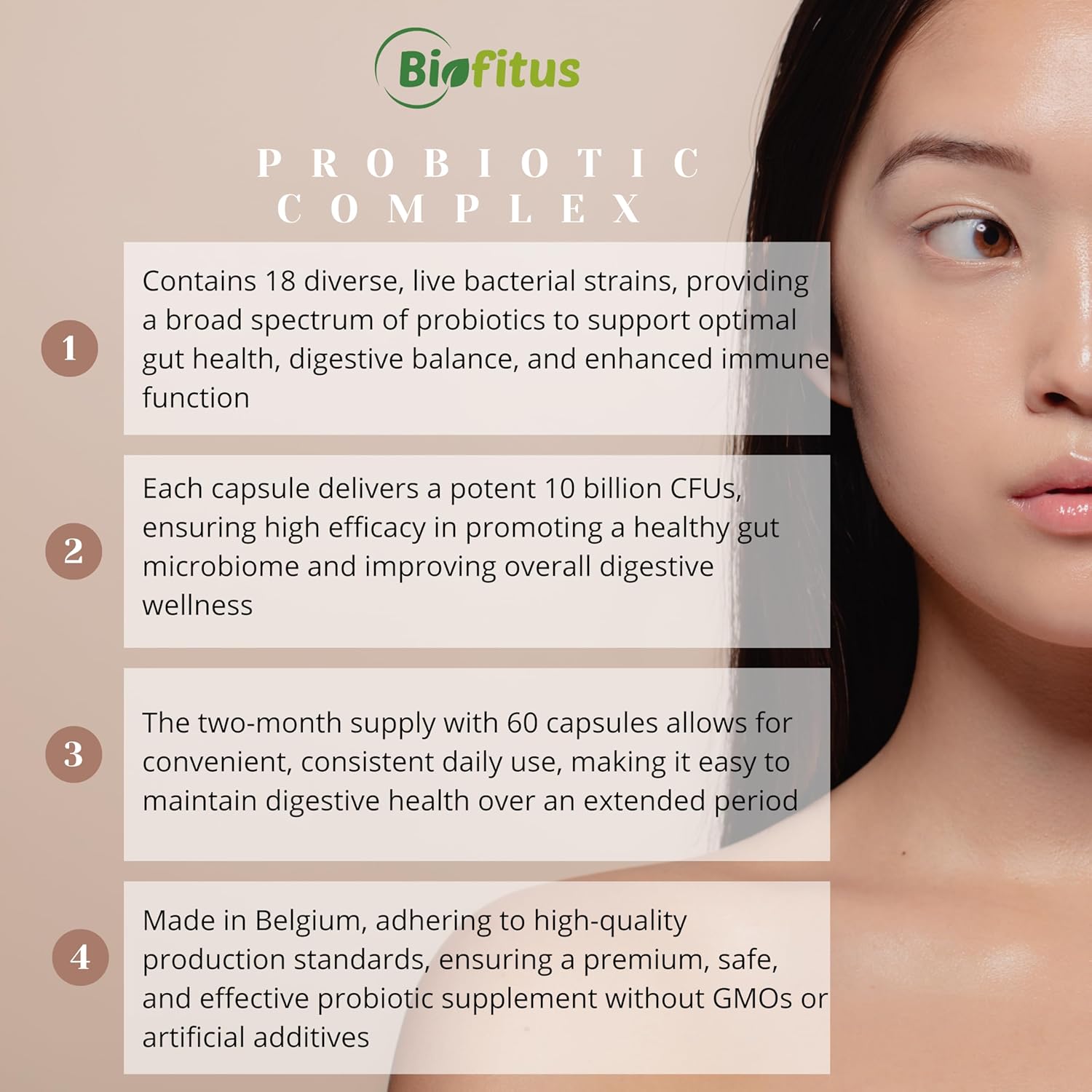 ### Wil je je spijsverteringsgezondheid verbeteren? Ontdek het geheim van een gezondere en gelukkiger darm met Biofitus Probiotix Complex. Onze geavanceerde formule is ontworpen om je spijsverteringsstelsel te ondersteunen, je welzijn te verhogen en ervoor te zorgen dat je je elke dag goed voelt. Hoe? Verbeterde gezondheid van de gezondheid – Neem afscheid van winderigheid en verwelkom een soepele spijsvertering. Met 18 verschillende stammen nuttige bacteriën, waaronder Bifidobacterium en Lactobacillus, ondersteunt onze geavanceerde formule je spijsverteringsstelsel als nooit tevoren. **Verhoogd algemeen welzijn** – Voel je elke dag beter, met een boost aan gezondheid en energie. Onze veganistische, natuurlijke ingrediënten, gecombineerd met de voordelen van 18 verschillende stammen, helpen je om een evenwichtige en levendige levensstijl te leiden. **Effectieve post-antibacteriële behandeling** – Ontvang snel na een antibioticabehandeling! Ons uitgebreide aanbod van 18 probiotische stammen uit België helpt bij het herstel en het behoud van een gezond darmmicrobioom voor een langdurige gezondheid van het spijsverteringsstelsel. **Verlichting van spijsverteringsproblemen** – Bevrijd jezelf van spijsverteringsproblemen met ons krachtige probiotische mengsel. Elke capsule met 10 miljard CFU ondersteunt je darmgezondheid en houdt de vervelende spijsverteringsproblemen op de voet. **Ondersteuning van het immuunsysteem** – houd je afweer sterk. Onze zorgvuldig geselecteerde probiotische stammen ondersteunen samen met essentiële voedingsstoffen zowel je darmen als je immuunsysteem en helpen je gezond en resistent te blijven. Regelmatige darmbewegingen: geniet van het gemak van een regelmatige en comfortabele stoelgang met onze probiotische formule met hoog CFU-gehalte. Elke capsule bevat een robuuste mix van nuttige bacteriën die een gelijkmatig spijsverteringsritme garanderen. **Snelle positieve effecten** – voel snel verbeteringen. Onze maagsapresistente, gemakkelijk in te slikken capsules zorgen ervoor dat de probiotica je darmen levendig en monter bereiken, en zorgen voor snelle verlichting en ondersteuning. **Verminderde maagklachten** – Zeg vaarwel tegen winderigheid, winderigheid en maagpijn met onze uitgebreide probiotische formule. De toegevoegde prebiotica, zoals inuline, doen wonderen om je spijsverteringsstelsel in evenwicht te brengen en te kalmeren. **Verbeterde gezondheid van de huid** – stralen van binnenuit. Onze probiotica ondersteunen niet alleen je darmen, maar dragen ook bij aan een gezondere huid. Zie er beter uit en voel je prettiger met een helderdere, stralende huid. **Risicovrije garantie ** – Wij geloven in de kracht van ons product. Als je niet helemaal enthousiast bent, bieden wij een risicovrije garantie voor je gemoedsrust. Probeer het vandaag nog uit zonder je zorgen te maken. Verander nu je spijsverteringsgezondheid. **In de winkelmand leggen**