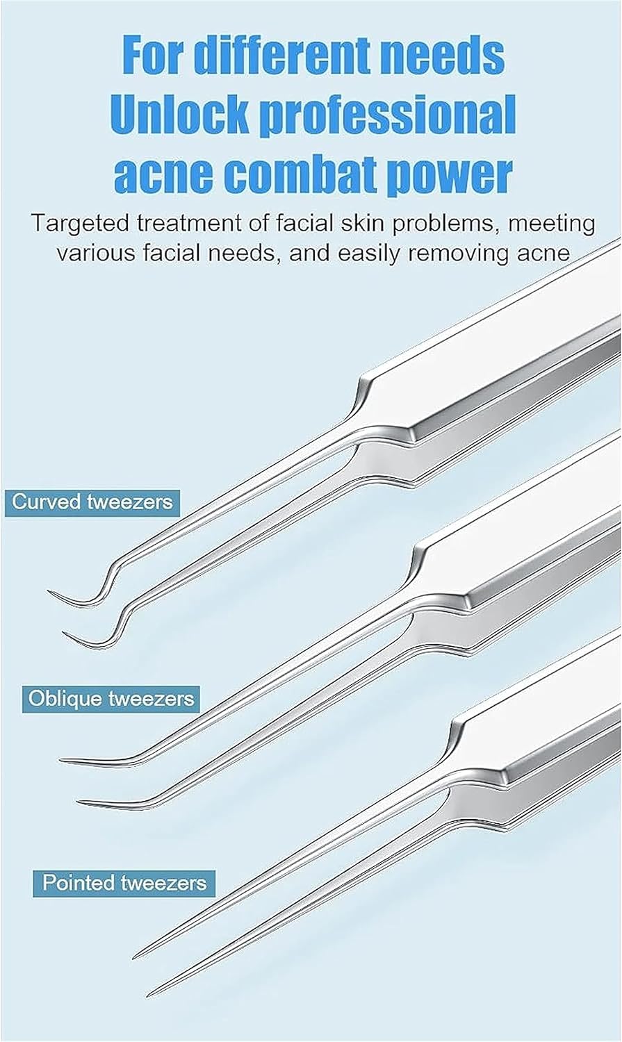 Pimple Popper Blackhead Ingrown Hair Remover Tweezers Kit: include 3 different shapes tweezers tools- Straight Tweezers, Needle Tweezers, curved hook Tweezers for different needs.