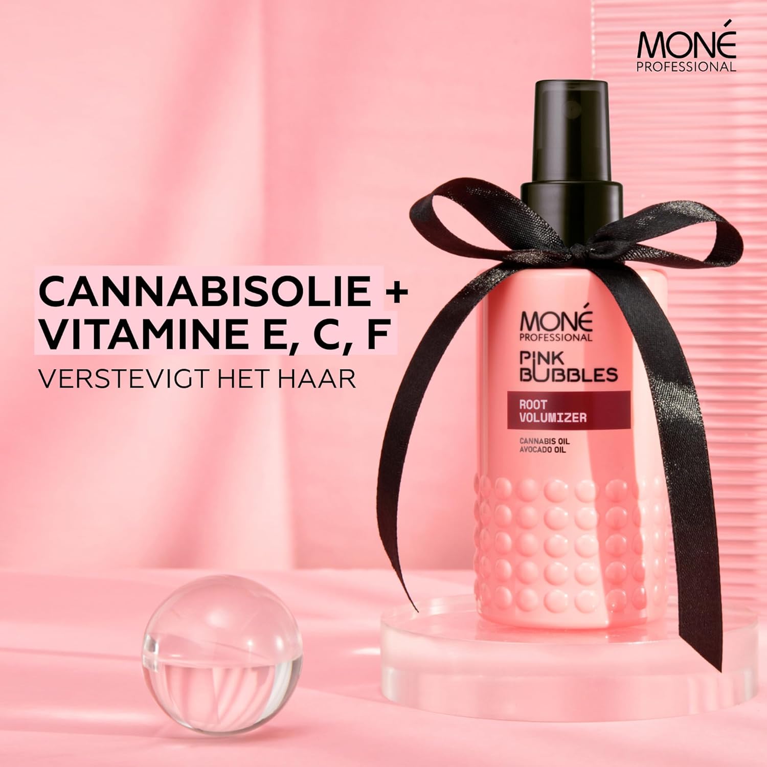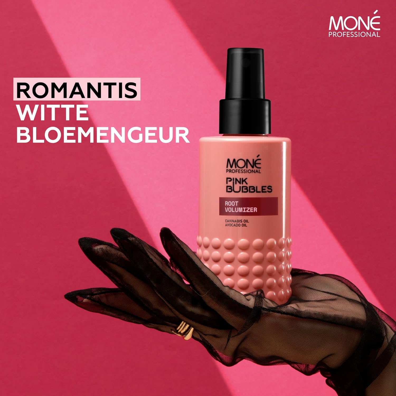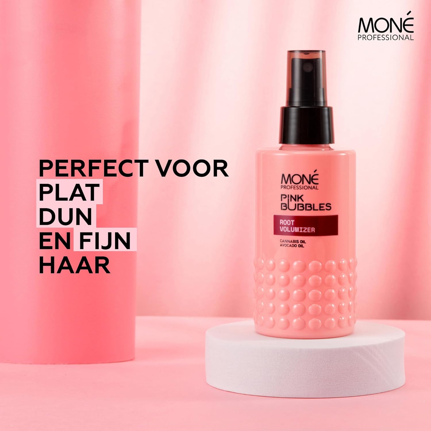 Bekijk deze professionele spray voor een ongelooflijke wortelboost in je haar – MONÉ Professional Spray Root Volumizer, 150 ml, tilt je haar direct bij de wortels op en geeft het veerkracht en volume. Dit kleine juweeltje, onderdeel van de Pink Bubbles-reeks, heeft een ondeugende afrodiserende geur met tonen van roze peper, kastanje, witte muskus en natuurlijk vanille (we houden ervan in onze producten, omdat meer dan 70% van de mannen het als de meest aantrekkelijke geur beschouwt, zoek het maar op het internet op). Deze spray voegt glans toe en creëert een flexibele textuur, zonder je haar te verzwaren. Het is de perfecte voorbereiding voor het stylen, vooral als je fijn haar hebt (we weten hoe moeilijk het is om fijn haar volume te geven, maar niet met deze spray). De mix is behoorlijk slim – met hennepolie die rijk is aan linolzuur en avocado-olie, volgepakt met de vitamines E, C en F – het versterkt, hydrateert en voedt, terwijl het tegelijkertijd met zijn antioxidatieve krachten tegen de boosdoeners vecht. Hennepolie trekt snel in om voedingsstoffen en vocht vast te houden zonder een vettig residu achter te laten. Zo krijg je volle lokken, waarbij het vocht ingesloten is en slechts een vleugje vetzuren aan de buitenkant, wat je haar dat weelderige volume en dikte geeft. Het is het ultieme stylingproduct, geschikt voor elk denkbaar haartype: droog, normaal, vet, gekleurd, met highlights, beschadigd, blond, krullend, golvend, poreus, dun, grof, verzwakt – geschikt voor iedereen. Hoe gebruik je het? Spray gewoon zonder uit te spoelen op de wortels en style. En, voor de duidelijkheid, het wordt allemaal in Griekenland geproduceerd. Laat je overtuigen.
