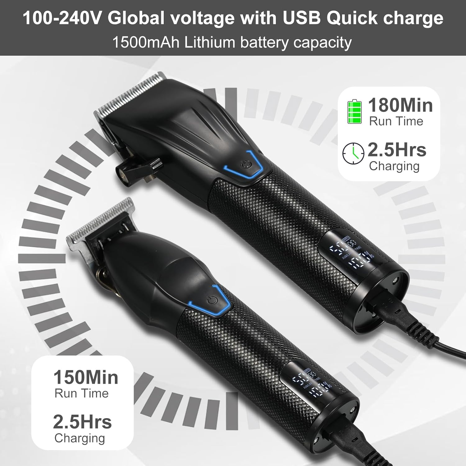 Draadloze batterij en led-display: de professionele tondeuse is uitgerust met een krachtige 1800 mAh batterij, tot 180 minuten gebruiksduur met 150 minuten opladen, T-blade trimmer biedt tot 150 minuten gebruiksduur met 150 minuten opladen, intelligente weergave van de resterende elektriciteit en de waarde van de motorsnelheid, volg de energiestatus, kan draadloos worden gebruikt of gebruikt