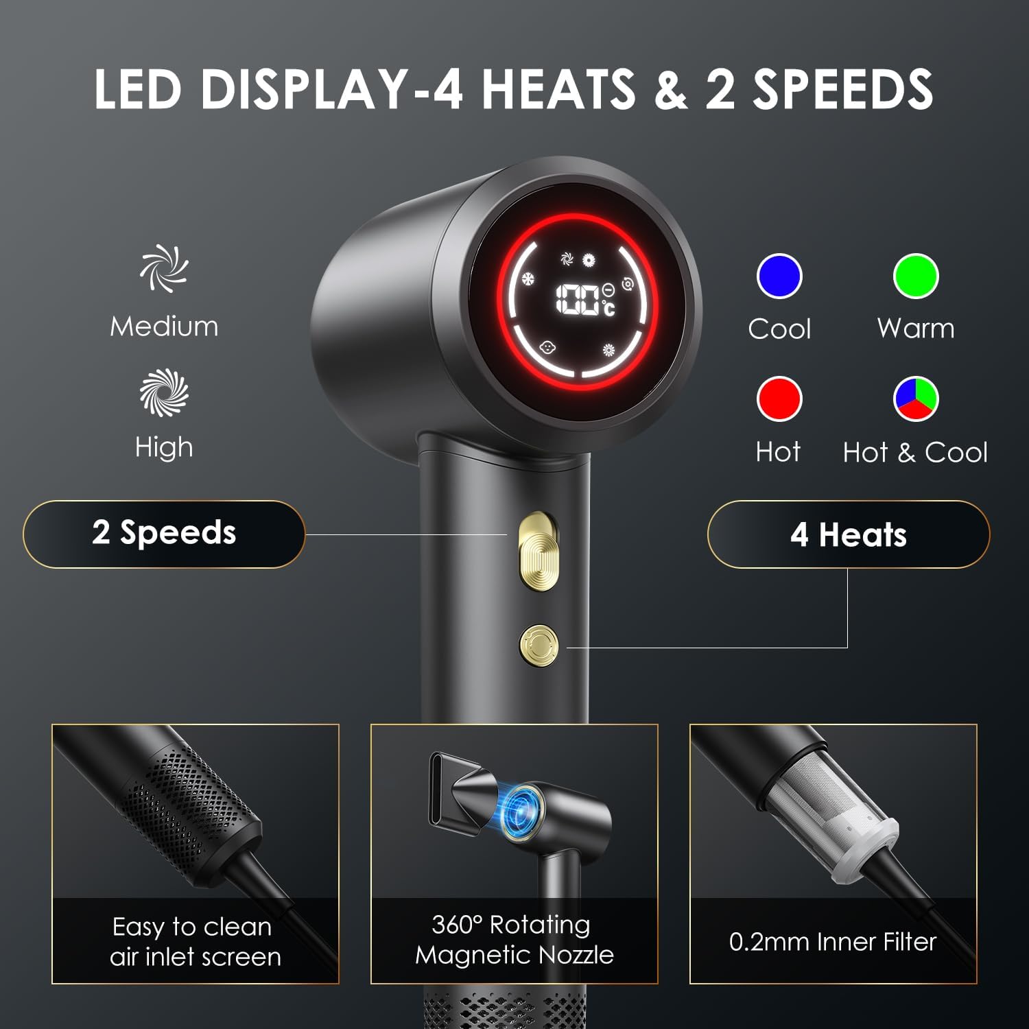 Intelligente temperatuurregeling: de CLAM haarföhn beschikt over 2 windsnelheden, 3 ledlampen en 4 modi. Je kunt met de verwarmingsknop tussen de modi schakelen. Blauw betekent koude lucht, groen betekent warme lucht en rood betekent warme lucht. Houd ingedrukt om tussen warme en koude modus te schakelen. Bovendien regelt hij de warmte door een krachtig chipbesturingssysteem om oververhitting en haarschade te voorkomen