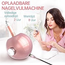 Oplaadbaar en grote batterijcapaciteit: de 1000 mAh lithium-ionbatterij heeft een grote capaciteit voor urenlang werk en kan na een volledige lading ongeveer 8 uur werken (ongeveer 2 uur). Hierdoor kunt u altijd en overal manicures en pedicures doen.