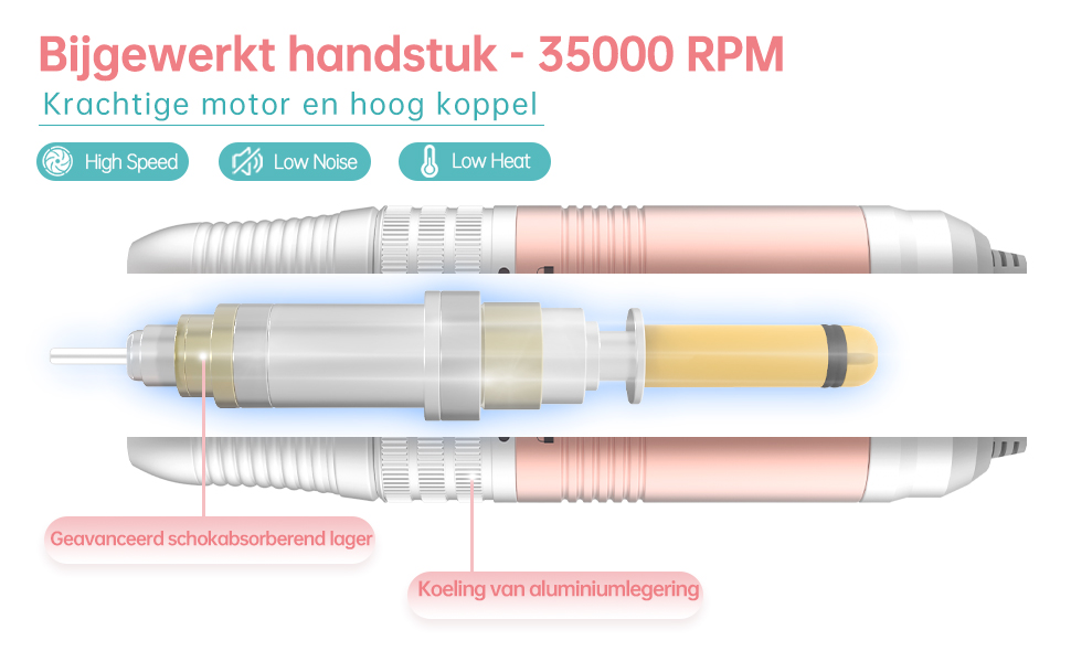 Laag geluidsniveau en lage trillingen: het nieuw opgewaardeerde handstuk is volledig gemaakt van een hoogwaardige aluminiumlegering, die warmte effectief afvoert en een lange levensduur heeft; het lichtgewicht handstuk maakt een laag geluidsniveau en lage trillingen tijdens het werken, geschikt voor zowel salon- als thuisgebruik. U hoeft zich geen zorgen meer te maken dat u uw gezin stoort.