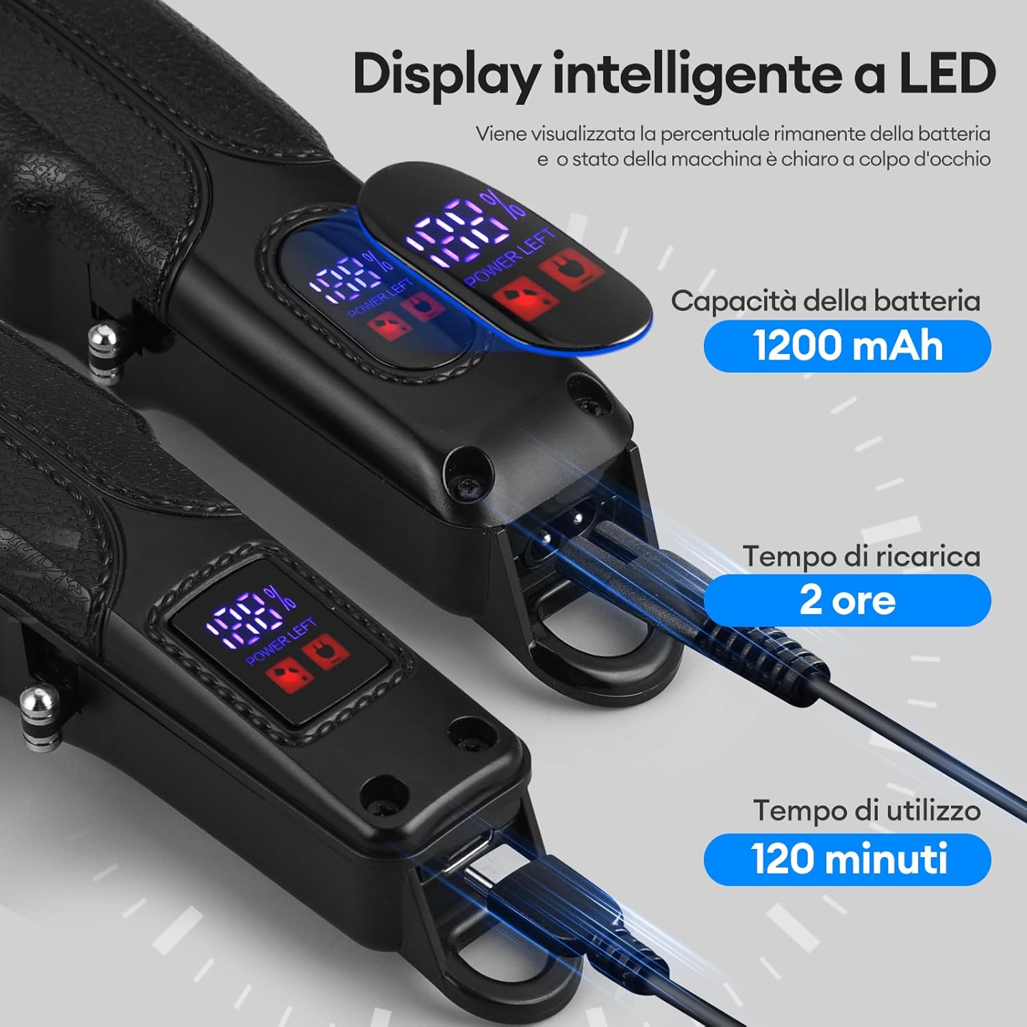 Led-display en lange levensduur: de professionele tondeuse voor mannen kan na 2 uur volledig opladen tot 120 minuten werken. Het led-display geeft duidelijk de resterende energie, het laadniveau en de smeerherinneringen aan. De baardtrimmer met T-lemmet kan na 2 uur volledig opladen tot 90 minuten snijden. Zowel de trimmer als de grastrimmer kunnen met of zonder draad worden gebruikt.