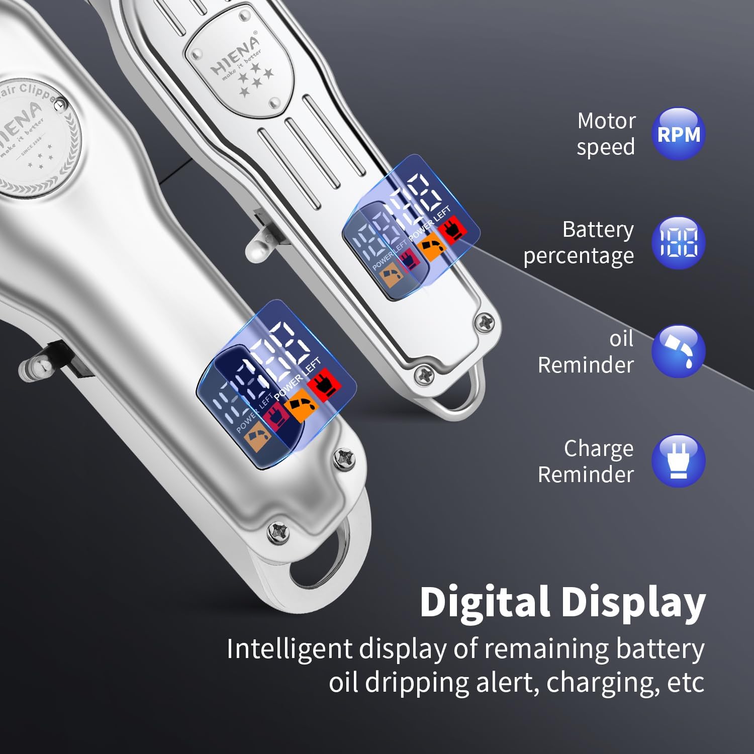 【Slim led-display】Beide draadloze tondeuses zijn uitgerust met een geavanceerd LED-display, dat duidelijk belangrijke informatie over de tondeuse kan weergeven, inclusief oplaadherinneringen en herinneringen voor het smeren van het blad.