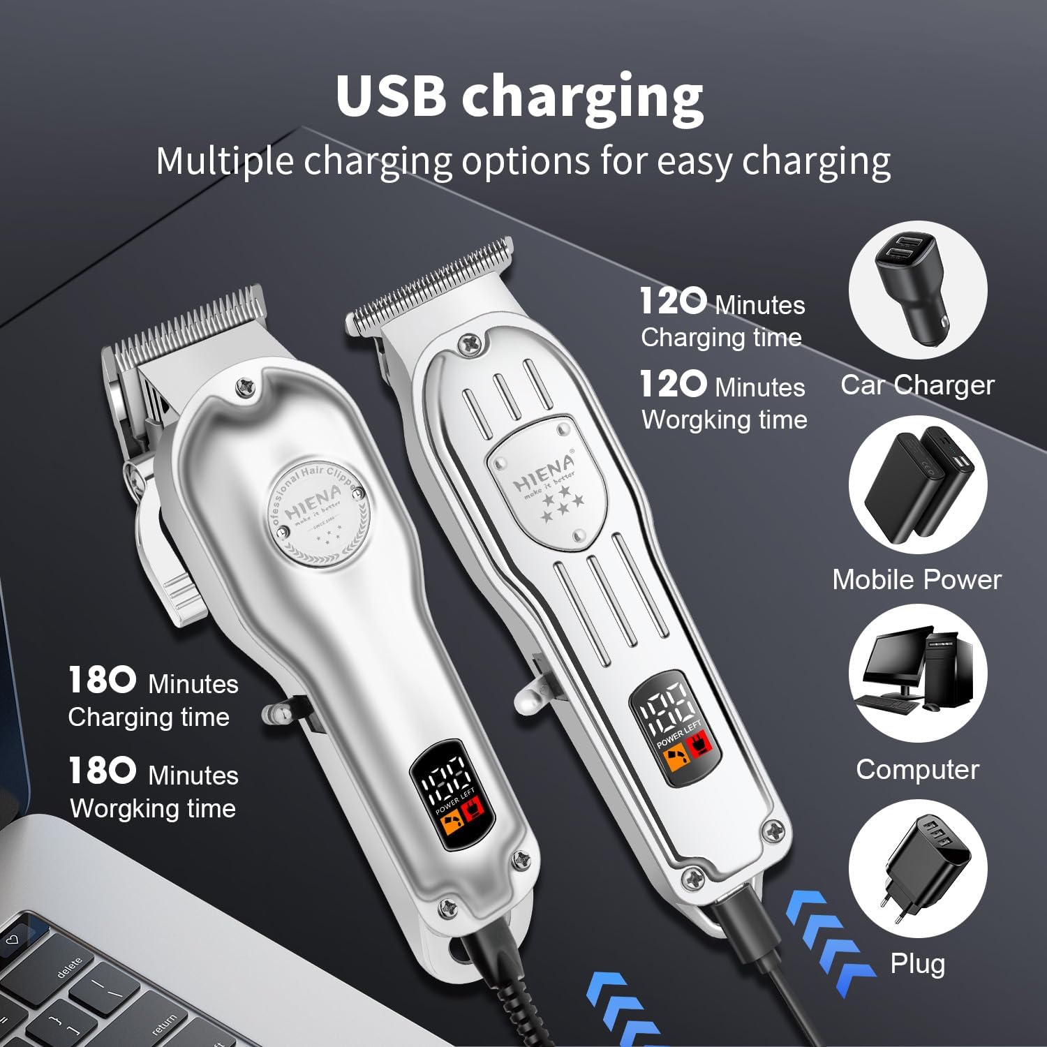 Efficiënt snel opladen via USB: de elektrische tondeuse en trimmer zijn uitgerust met een snel USB-oplaadsysteem, dat altijd en overal klaar is voor gebruik, waardoor het gedoe met omslachtige kabels wordt voorkomen. Deze kappersschaar hoeft slechts 3 uur te worden opgeladen om een batterijduur van maximaal 180 minuten te bieden. Bovendien hoeft deze kapperstrimmer slechts 2 uur opgeladen te worden om 120 minuten gebruik te garanderen. (Het wordt aanbevolen om voor het eerste gebruik volledig op te laden).