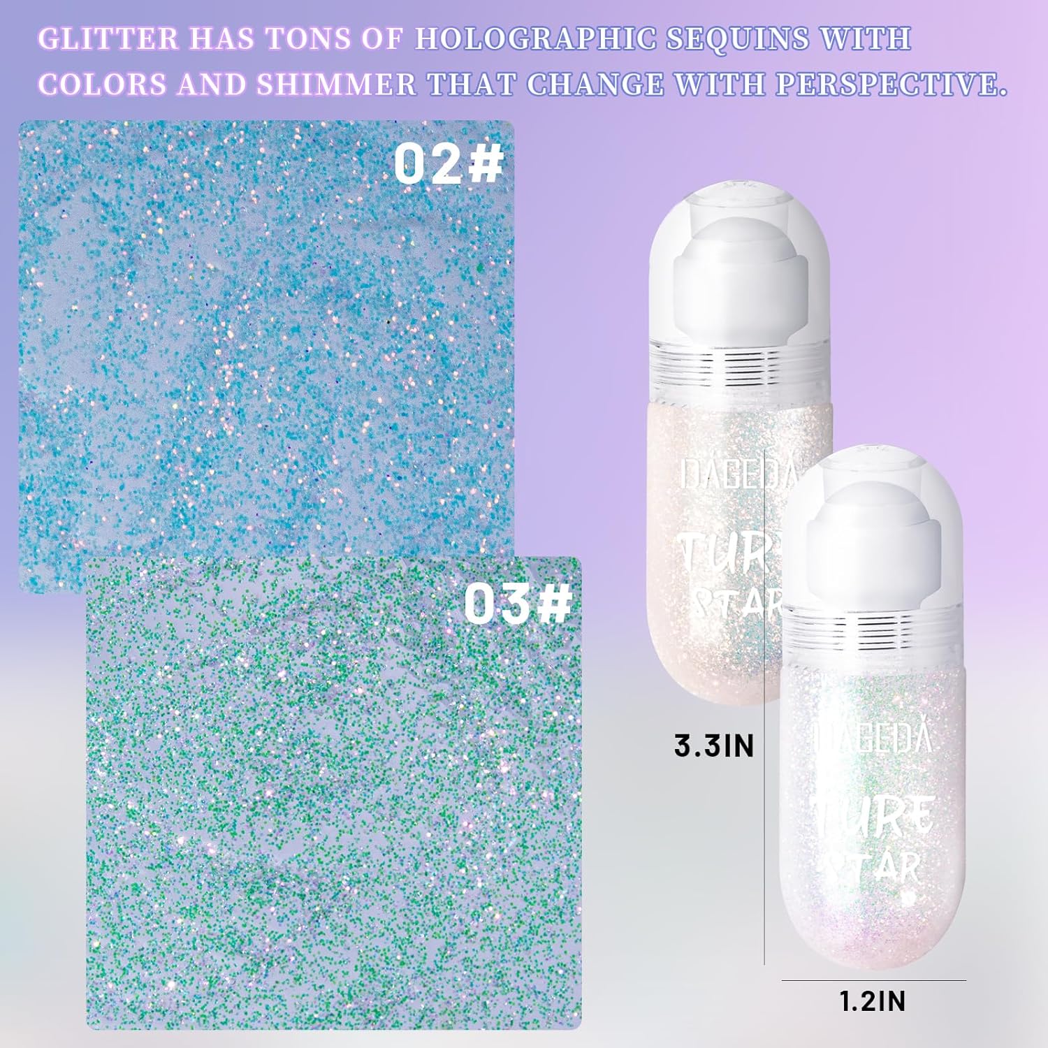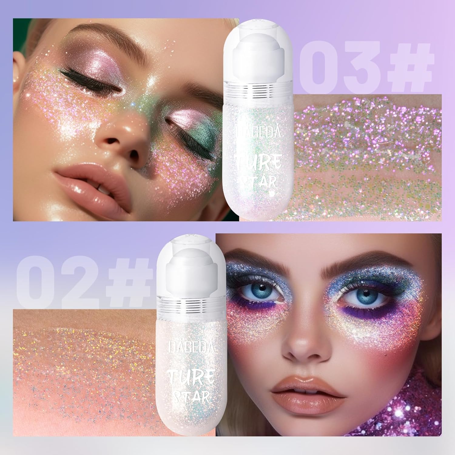 【Convenient Design】Unlike normal face glitter, the roll-on glitter gel does not require additional brush or fingers to apply. Simply turn the bottle of the face glitter down and turn the glitter bottle down, gently shake it a few times and apply it to your skin. The shiny gel will easily apply evenly to your skin.
