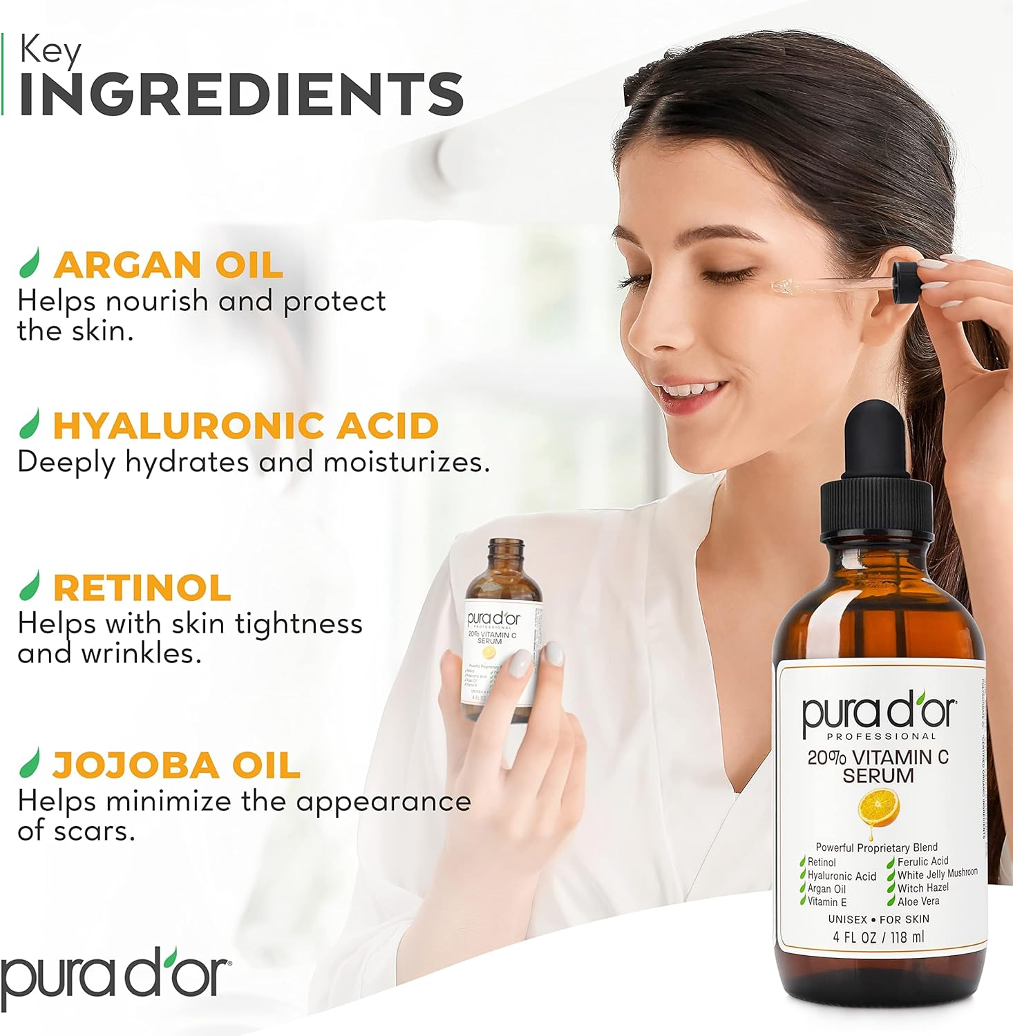 PURA D’OR 20% Vitamin C Serum Premium Professional Grade (118 ml) für Gesicht und Augen Vollständigste Formel Hyaluronsäure, Vitamin E und Arganöl, Behandlung von dunklen Flecken, Akne, Falten, Männern und Frauen