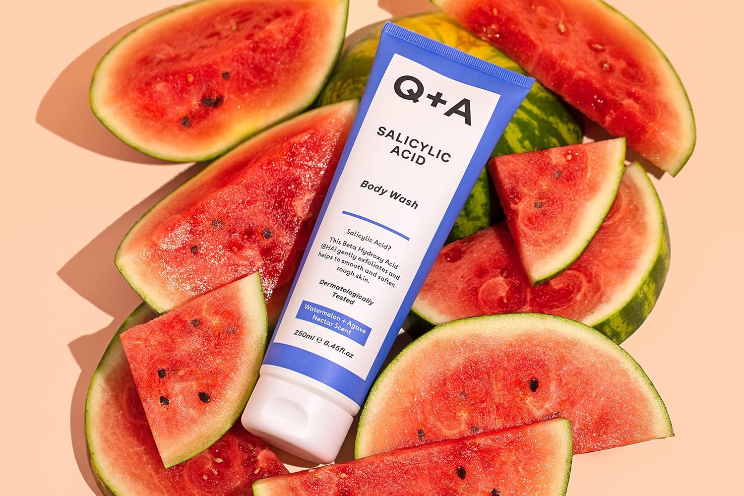 Q+A Salicylzuur Douchegel voor Verkwikkende Lichaamsverzorging, op gel gebaseerd doucheproduct, exfolieert, maakt glad en verzacht de huid, met Groene Thee-extract, 250 ml.
