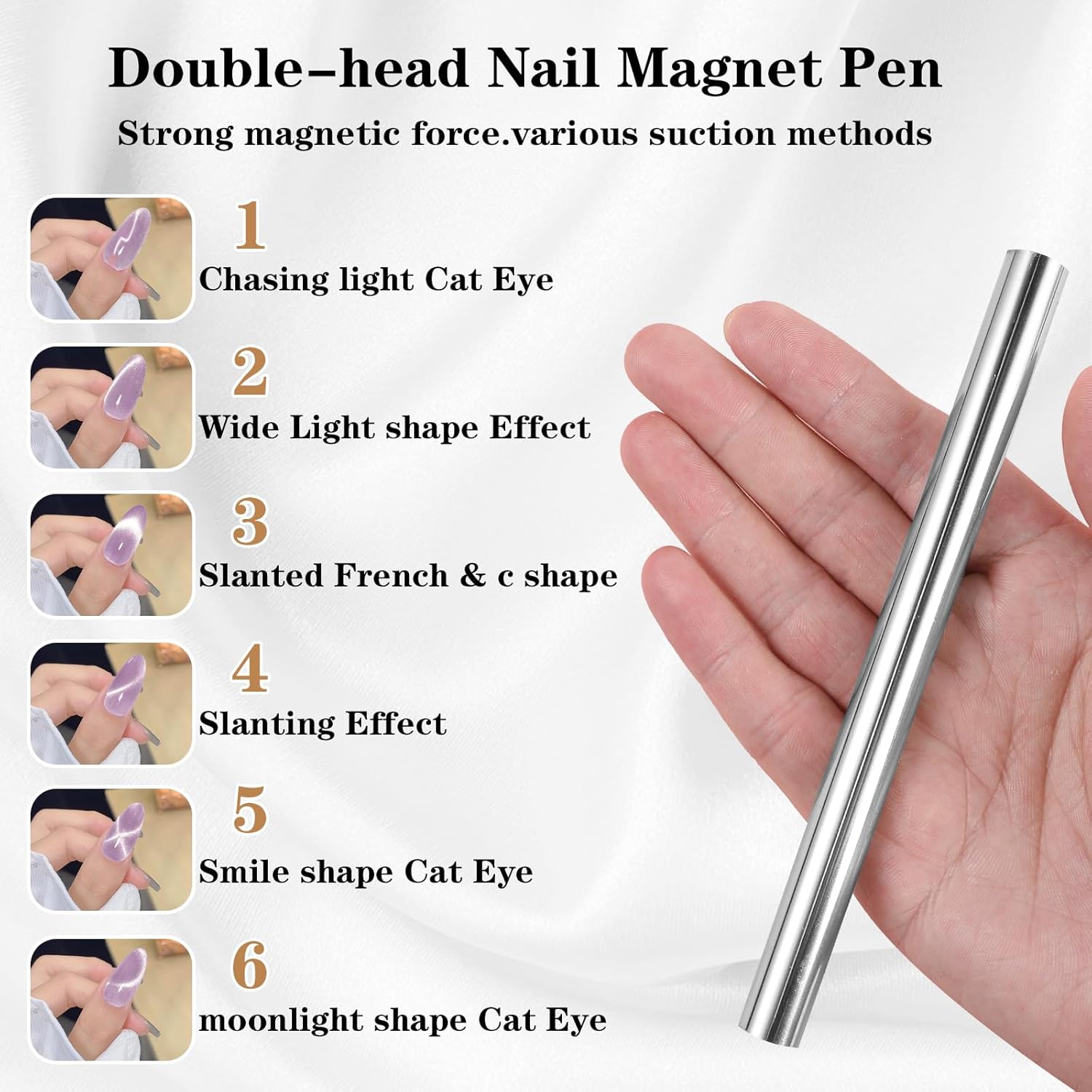 Perfecte maat: Je krijgt een nagelmagneet voor nail art, zilveren cat eye gel nagellak magneet lengte: 15 cm, kevers cat eye gel nagellak magneet diameter: 1,3 cm, magneten voor cat eye gel polish gewicht: 64 g. Deze cat eye nagelmagneet is verkrijgbaar in twee hoofden, en er is slechts één maankat nagellakmagneet nodig om verschillende cat-eye-effecten te produceren.