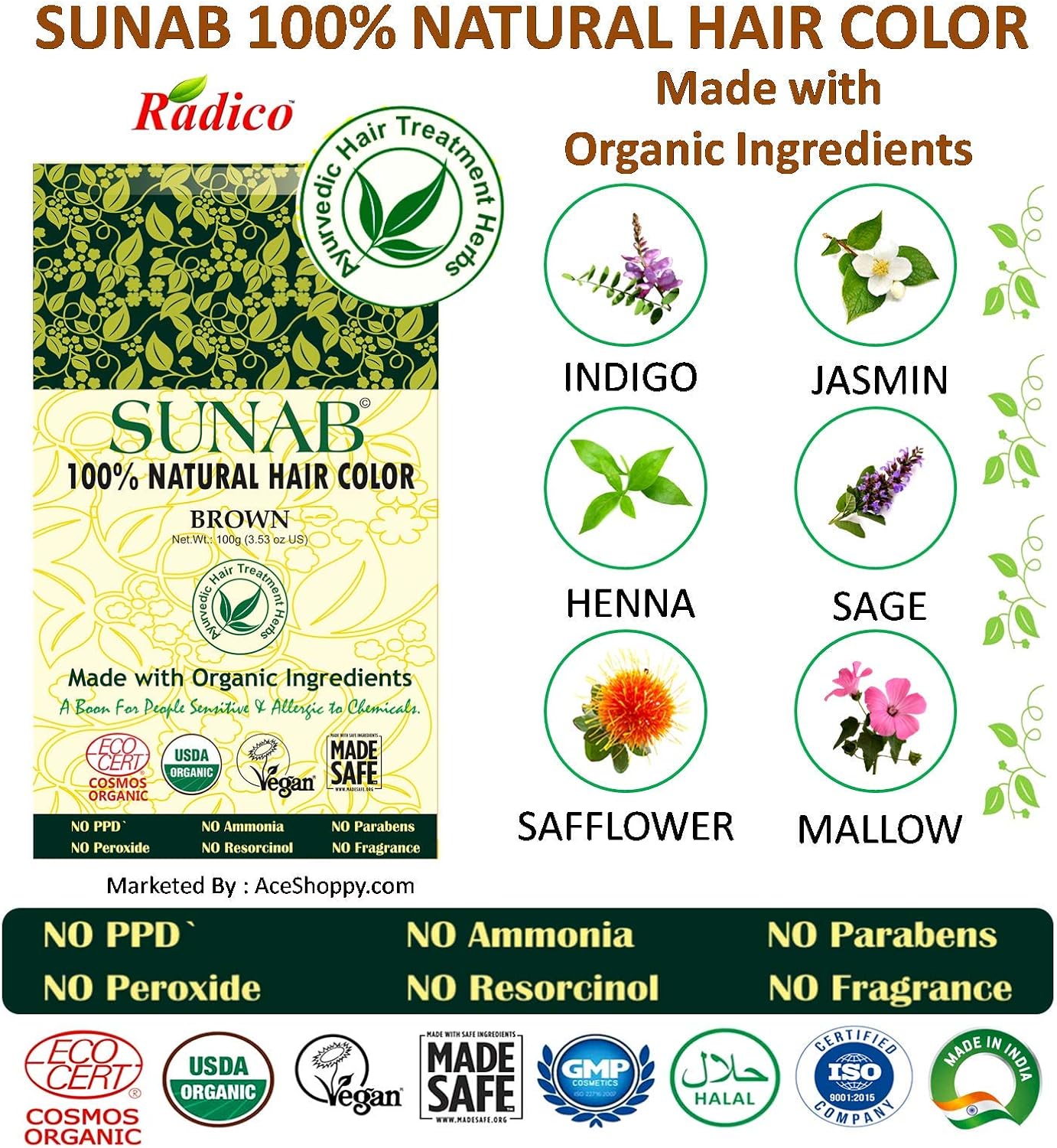 Radico 100% NATURAL SUNAB Brown/Bruin 100% Natuurlijke BIO Organic 9-Kruiden Haarverf Zonder Ammoniak. Ammonia. PPD. PTD. Peroxide. Waterstofperoxide etc. o.a.Henna. met o.a. ECOCERT 100g (Brown)