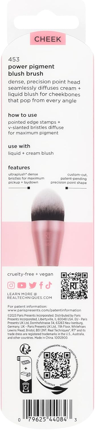 The Real Techniques Power Pigment Blush makeup brush has a dense, domed, precise head to seamlessly spread blush for bang bones that populate from any angle. The 453 brush has a luxurious, domed shape designed to capture and disperse pigment for your desired look. This blush brush has soft, dense bristles making it perfect for blending both liquid and cream-blush. With maximum pickup and laydown, precise application and targeted shapes – this triple threat design will make your favorite blush super easy. It has a new custom cut precision point shape and UltraPlush, high quality, dense bristles for maximum pickup and laydown. To make your tools longer, it is recommended to clean your brushes once a week using the Real Techniques Brush + Sponge Cleansing Gel As with all our RT products, this makeup brush is 100% vegan and cruelty-free.