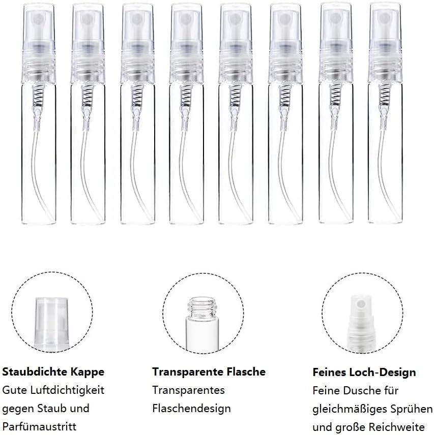 Gibt 3 Punkte, die bei kleinen abfüll Sprühflaschen wichtig sind vor allem für parfum:1. Müssen dicht sein also guter Schraubverschluss2. Sollten nicht zu viel versprühen3. Und das Wichtigste, die sprüh Öffnung des Sprühkopfes darf beim drücken nicht unter den Sprühhals gehen, wodurch immer ein Drittel des Spühnebels in den verschluss laufen würde.Alle 3 Punkte treffen zu also 5 Sterne.Preis ist absolut Top! Dabei noch 2 Pipetten 2 Trichter und weit über 30 klebepunkte zur Kennzeichnung von Abfüllungen. Hervorragend verpackt und schnelle Lieferung.Alles bestens gerne öfters