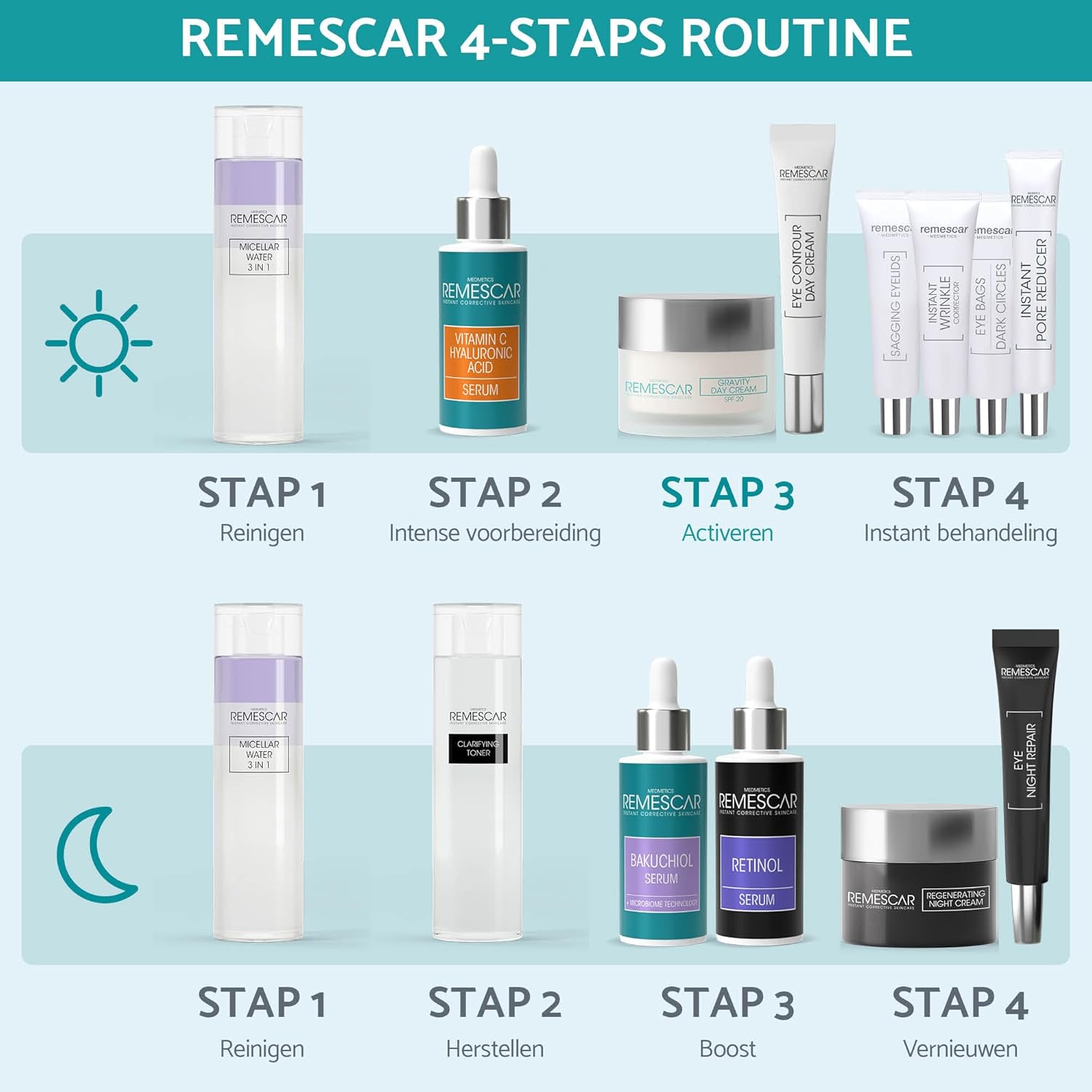 ★ HUIDPREPARATIE – Om de beste resultaten te behalen met onze Remescar producten is een goede voorbereiding van uw huid erg belangrijk. Wij hebben een volledige huidroutine ontwikkeld die uw huid voorbereidt en behandelt om de best resultaten te bereiken. We hebben 2 routines ontwikkeld; een Dag Routine die zich richt op het voorbereiden van de huid op bescherming tegen dagelijkse agressies. En de Nachtroutine, die gericht is op de regeneratie en het herstel van de huid terwijl u slaapt.
