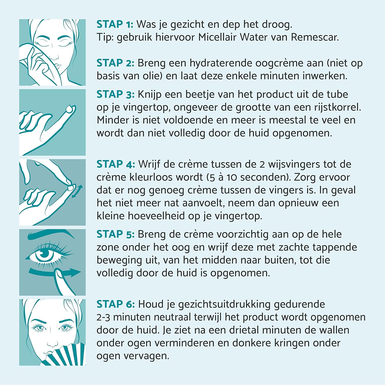 Stap voor stap instructies – Deze instructies begeleiden u bij het gebruik van het product en geven tips over hoe u het meeste uit de crème kunt halen. Om met Remescar Eye Bags & Dark Circles het beste resultaat te bereiken, is het belangrijk om je huid voldoende verzorging en ondersteuning te geven. Onze crème is geen gewone oogcrème, het is belangrijk om de gebruiksaanwijzing te volgen. We raden u aan om eerst te zorgen dat de oogcontour gehydrateerd is en vervolgens Remescar Eye Bags & Dark Circles aan te brengen om donkere kringen en wallen onmiddellijk te verminderen. Een handleiding is ook inbegrepen in de doos en op de verpakking.