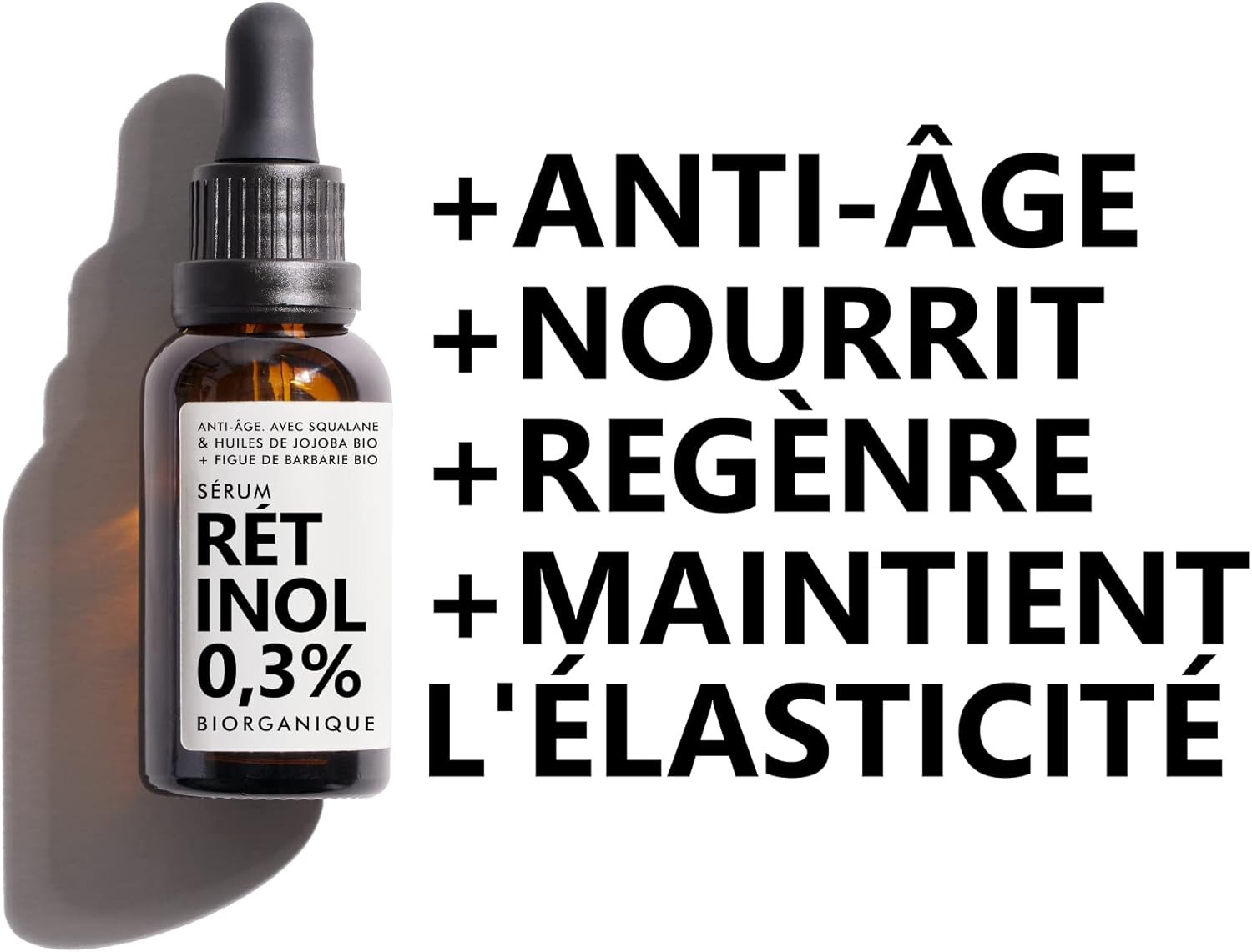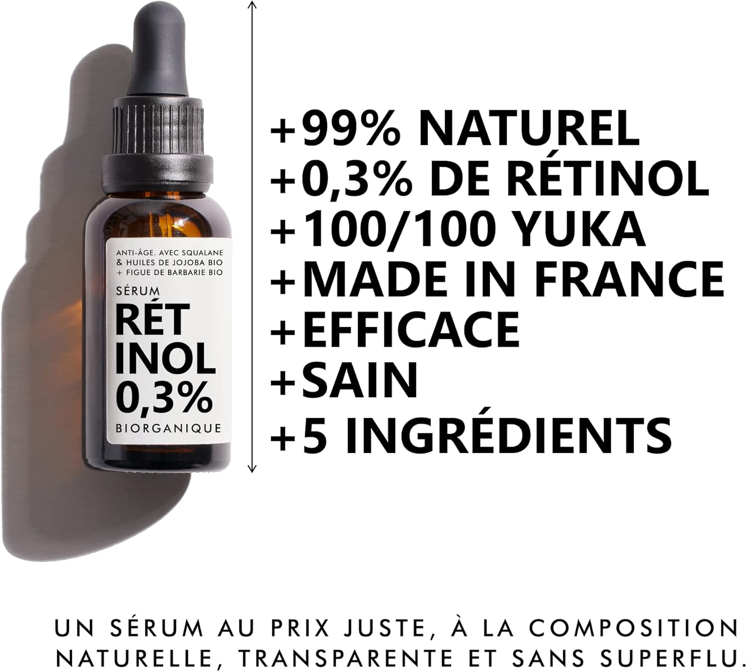 Eigenschappen: retinolserum, gemaakt en ontworpen in Frankrijk. Meer dan 99% ingrediënten van natuurlijke oorsprong. 100/100 yuka in een amberkleurige glazen fles voor optimale bescherming en met een glazen pipet voor een snel en nauwkeurig gebruik.