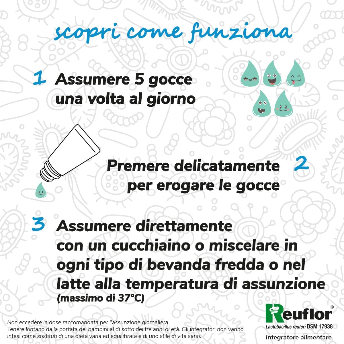 Reuflor® ImmunoD3 druppels, gemakkelijk voor kinderen in te nemen, is een voedingssupplement op basis van Lactobacillus reuteri DSM 17938 en vitamine D3. De Lactobacillus reuteri DSM 17938 is een melkzuurferment dat het evenwicht van de darmflora bevordert. Vitamine D3 of cholecalciferol draagt bij aan de goede werking van het immuunsysteem en de regelmatige opname en het gebruik van calcium en fosfor. Hoe gebruik je Reuflor® Immuno D3 druppels. Goed schudden voor gebruik. Druk voorzichtig op het reservoir om de druppels af te geven. De aanbevolen dosis is 5 druppels per dag, die tijdens de maaltijd wordt ingenomen. Een enkele dosis per dag is voldoende voor de inname van 400 IE (10 mcg) vitamine D3 en 108 CFU Lactobacillus reuteri DSM 17938 . De druppels kunnen direct in een theelepel worden ingenomen of met alle soorten koude dranken en melk bij de inneemtemperatuur (max. 37 °C) worden gemengd. Niet mengen met warme dranken. Ingrediënten: zonnebloemolie, Lactobacillus reuteri DSM 17938, volledig gehydrogeneerde koolzaadolie, vitamine D3 (cholecalciferol). Waarschuwing: Bij gebruik van het product bij kinderen jonger dan drie jaar moet het advies van de arts worden ingewonnen. Na het eerste openen is het product drie maanden stabiel op een koele plaats. Sluit de container na gebruik. Als de omgevingstemperatuur hoger is dan 25 °C, bewaar het product dan in de koelkast om de levensvatbaarheid van de melkzuurstof te garanderen. Niet in de vriezer bewaren. Buiten het bereik van kinderen jonger dan drie jaar bewaren. Overschrijd de aanbevolen dagelijkse dosis niet. Voedingssupplementen zijn geen vervanging voor een gevarieerde en evenwichtige voeding en een gezonde levensstijl.