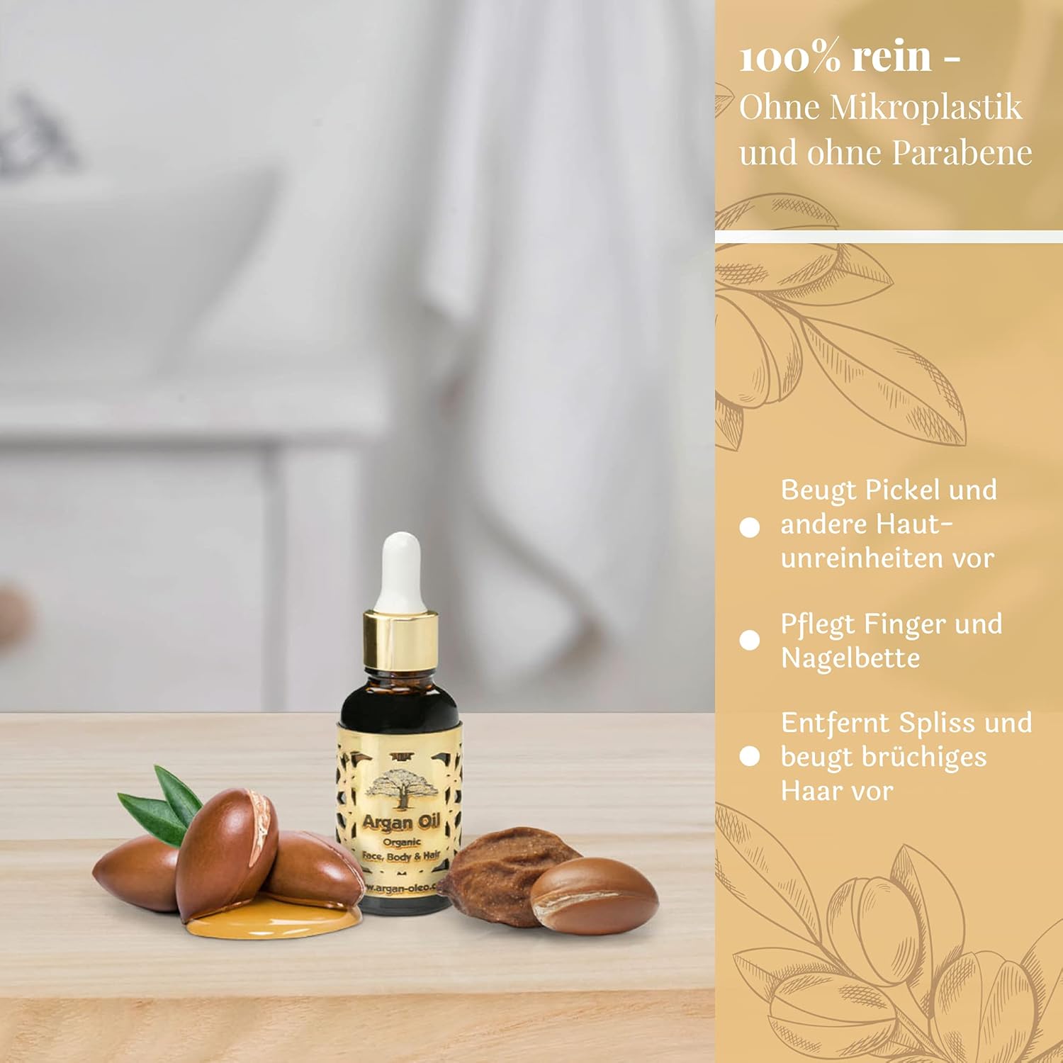 Das Arganöl wurde sehr pünktlich geliefert.Ich benutze es zur Ganzkörperpflege, ebenso zur Massage der Kopfhaut.Bereits nach zwei Tagen ist eine Verbesserung der Haut spürbar, sie ist sehr weich und feinporig geworden. Es ist von Vorteil, dass das Öl kaum Geruch hat.Ich habe alle Cremes für Körper und Gesicht weggelassen und pflege mich nur noch mit dem Öl. Es hinterlässt keinen Film, zieht sehr gut ein. Ich hatte mir erst die kleine 30 ml Flasche bestellt, aber nach den ersten positiven Ergebnissen die 100 ml gekauft. Die kleine Flasche habe ich meiner Freundin gegeben, mal sehen, wie sie damit zurecht kommt.Ich kann das Arganöl guten Gewissens empfehlen.
