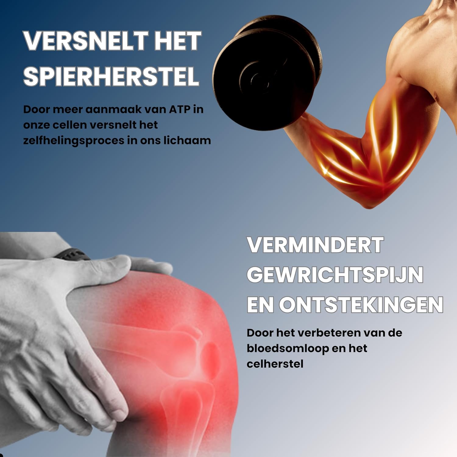 Versnel je herstel en verbeter je huid met deze krachtige rood licht therapie lamp. Met 60x5W LED’s op de golflengtes van 660 nm en 850 nm, biedt deze lamp de nieuwste lichttherapie technologie voor effectief herstel van spieren en weefsels, terwijl het tegelijkertijd de huid ondersteunt. Voordelen van rood licht therapie: Rood licht therapie bevordert celvernieuwing, vermindert ontstekingen en stimuleert de aanmaak van collageen. Dit draagt bij aan een snellere genezing van wonden, vermindering van rimpels en een algehele verbetering van de huidgezondheid. Daarnaast helpt het bij spierherstel na inspanning en kan het pijn verminderen bij chronische aandoeningen. Hoe werkt rood licht therapie: Rood licht therapie werkt door specifieke golflengtes van licht (660 nm en 850 nm) diep in de huid door te laten dringen. Dit stimuleert de mitochondriën in je cellen, de energiecentrales van je lichaam, waardoor cellen sneller kunnen regenereren en herstellen. Voor optimaal resultaat wordt aangeraden om de lamp dagelijks ongeveer 10 minuten te gebruiken, zodat je lichaam consistent profiteert van de voordelen van rood licht therapie.